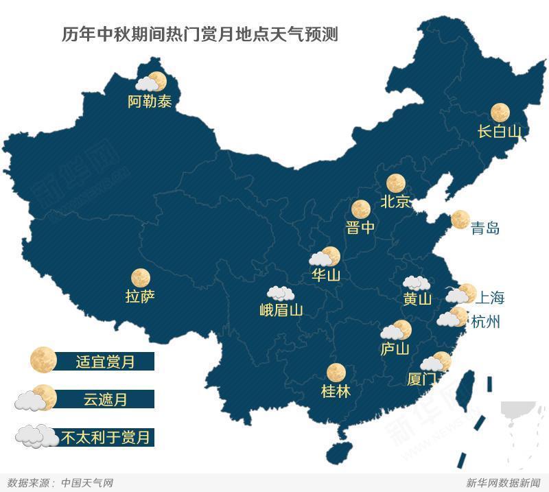 一般来说,我国北方相对于南方地区来说,中秋云少,有利赏月。北京20个中秋平均总云量为4.3成,即43%的天空被云所遮,西北干旱地区是我国云量最少的地方,也是赏月成功率最高的地方。我国中秋云量最多、月最难见的还是四川盆地,如四川峨眉山,20年来的中秋节没有一年云量少于5成的,且其中有16年都有雨,下雨几率达80%。