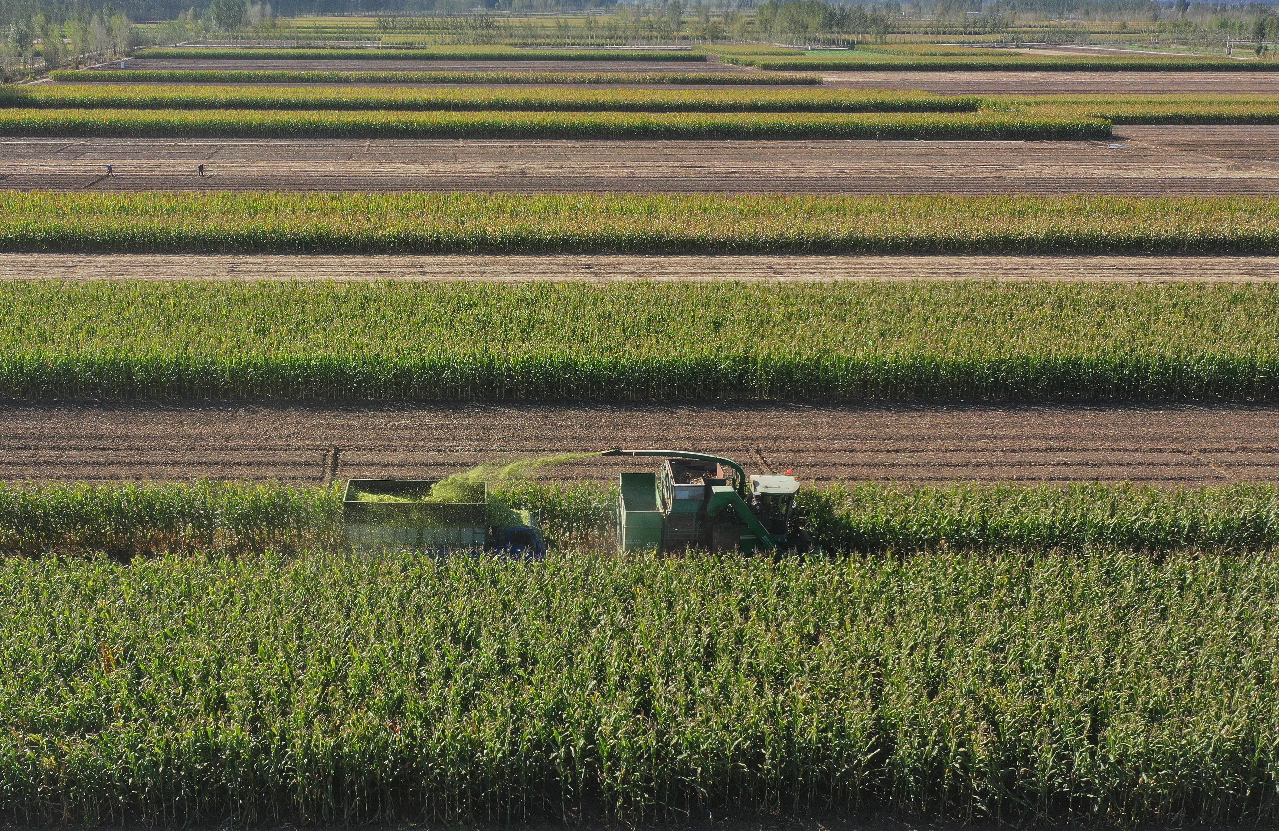 10月14日,唐山市丰润区李钊庄镇李虎庄村的农民驾驶收割机收获青贮玉米(无人机照片)。