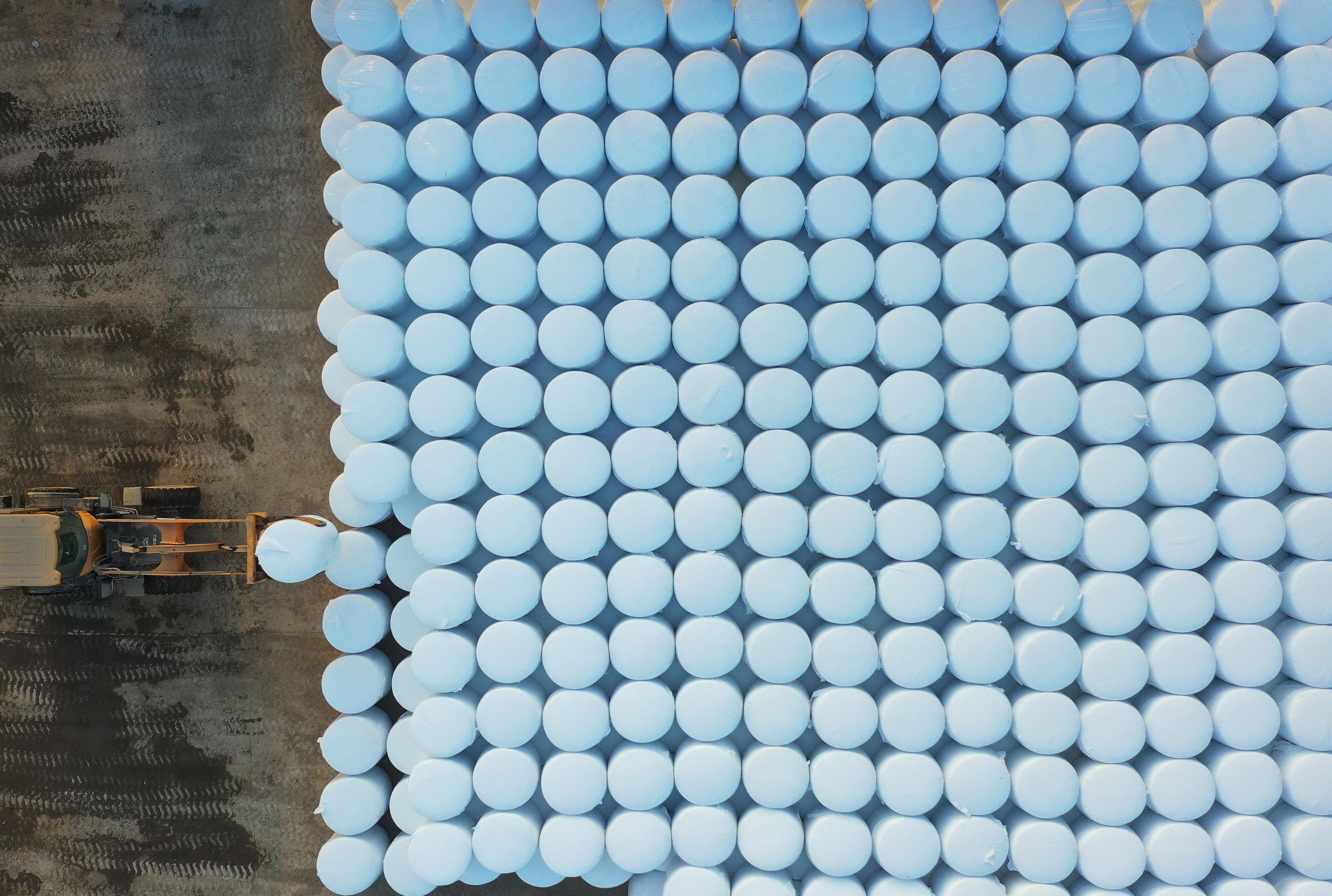10月14日,在唐山市丰润区丰登坞镇大郑庄村一青贮玉米收购点,工人在码垛裹包好的青贮玉米(无人机照片)。