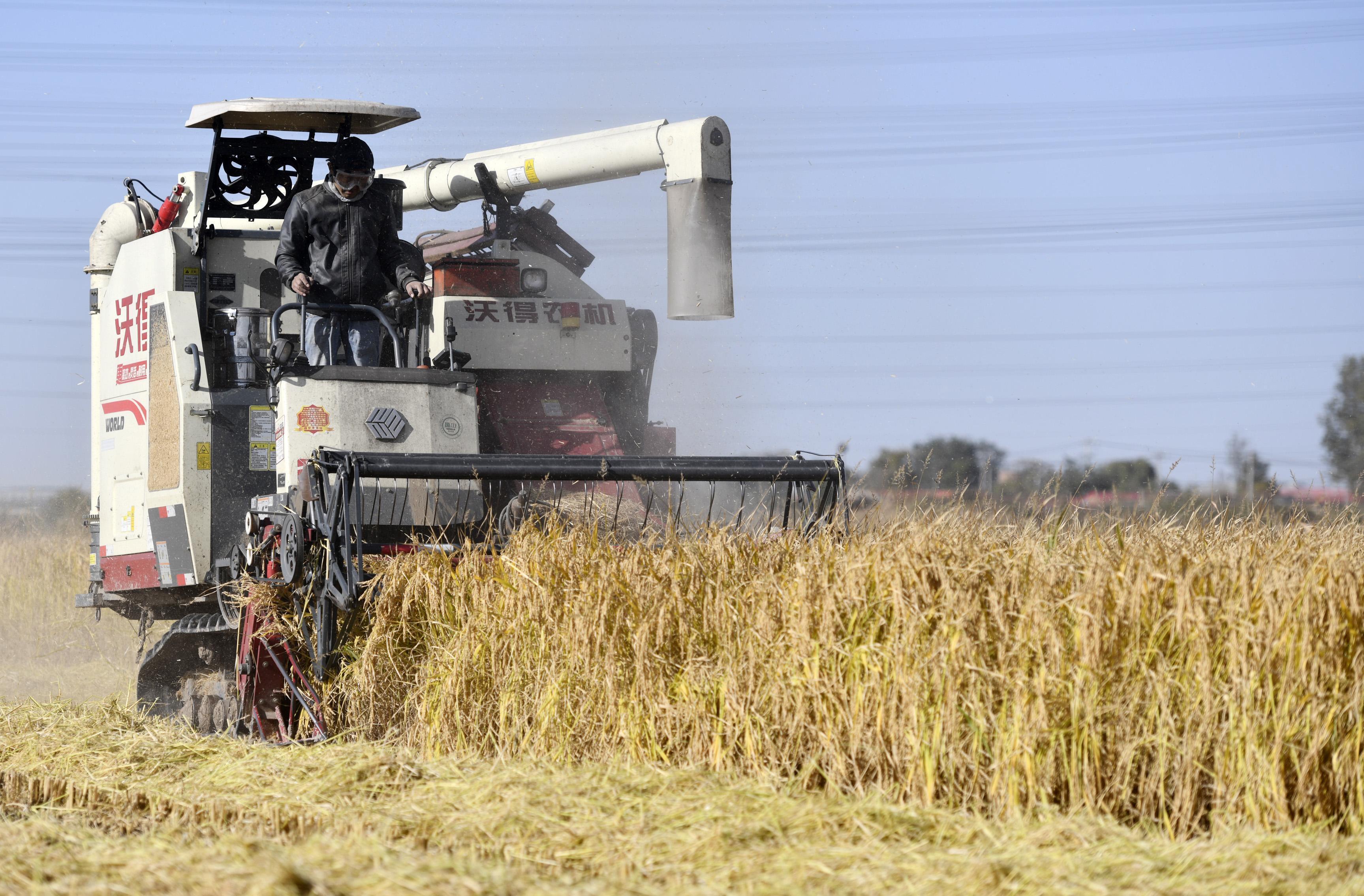 10月22日,在天津市津南区小站镇,农机在稻田内作业。