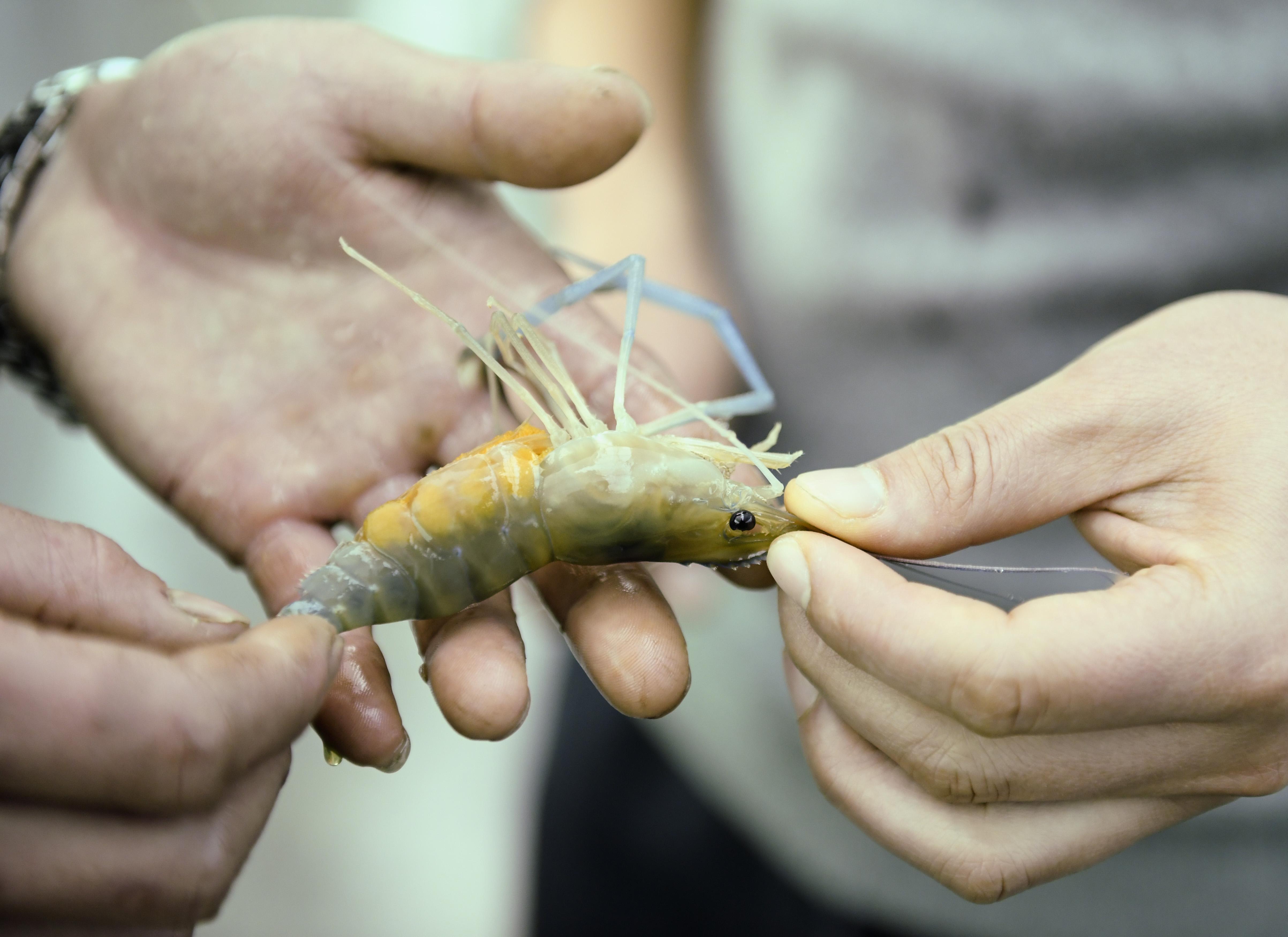 1月11日,工作人员在育苗车间查看一只抱卵雌虾的情况。
