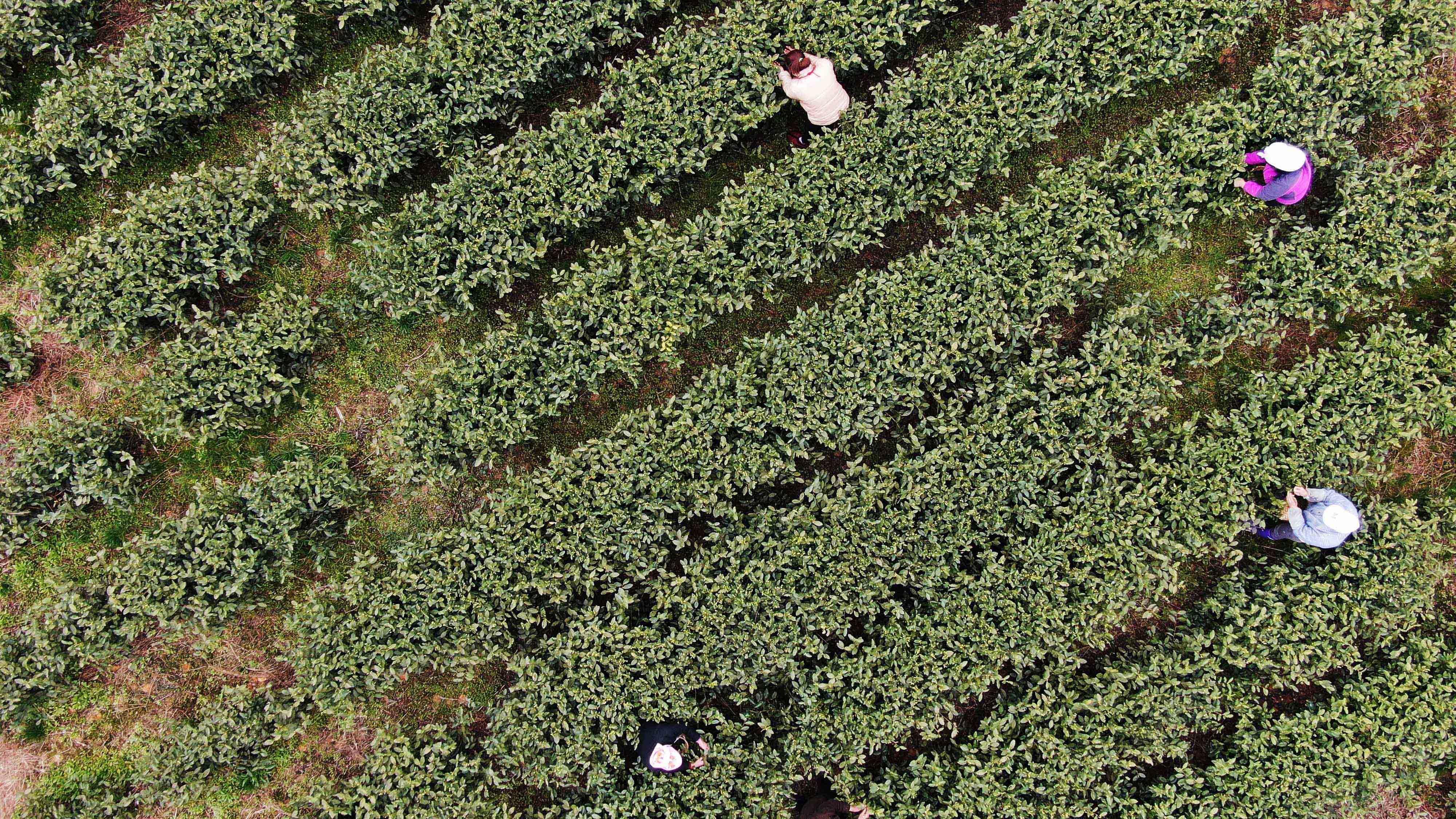 2月18日,在贵州省锦屏县平秋镇石引村的茶园里,茶农在采摘春茶(无人机照片)。