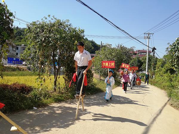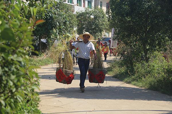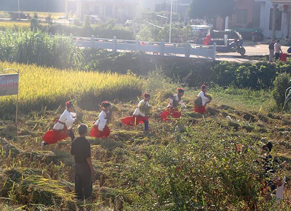 接下来的是各村特色展,夫妻成双成对割稻归打头阵
