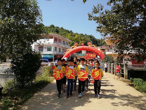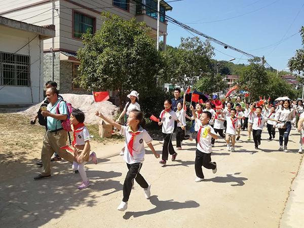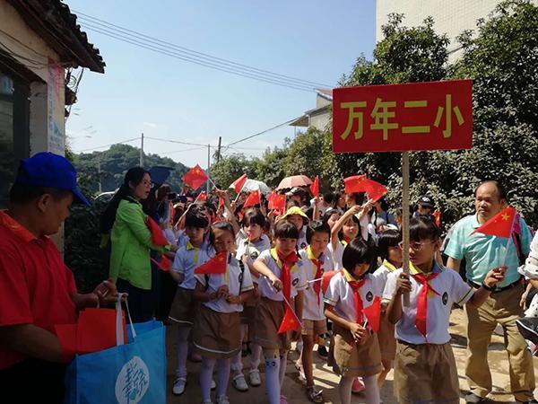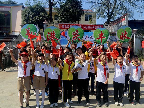 万年二小的120个学生们挥舞着国旗,欢庆着国庆节和丰收节