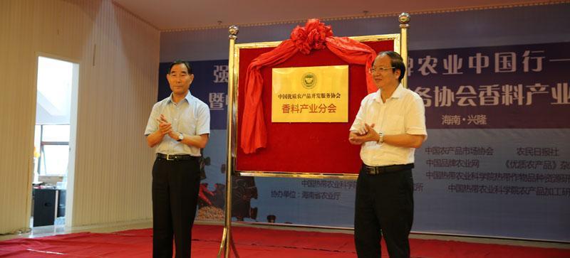 全国政协委员、中国优质农产品开发服务协会会长朱保成(左)中国热带农业科学院院长王庆煌为中国优质农产品开发服务协会香料产业分会揭牌。
