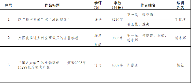 根据中国期刊协会《关于开展第36届中国新闻奖新闻期刊作品初评工作的通知》要求,中国农村杂志社拟推荐3件作品参评,现予以公示。公示期为4月16日至4月22日,共5个工作日。如有异议,请及时反映。