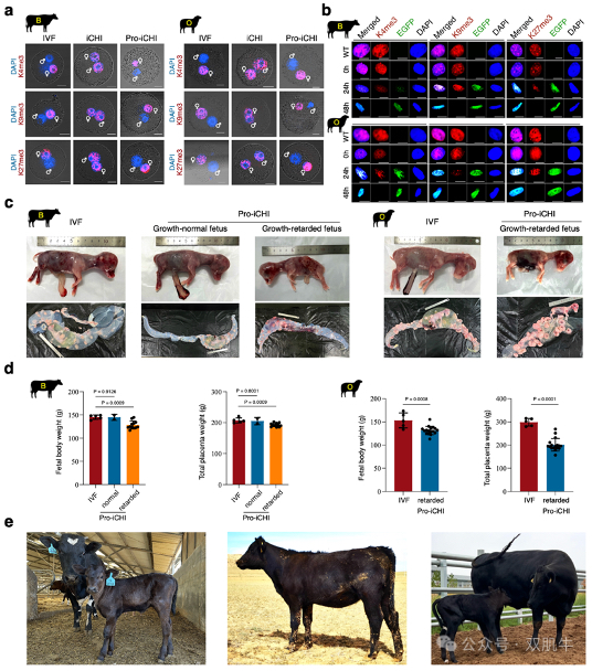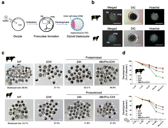 3.建立“类精子”表观修饰策略:当牛、羊haSCs直接注射到卵母细胞(iCHI)替代精子后,雌性原核中组蛋白H3K4/K9/K27me3修饰异位表达,成为重构胚胎发育的“致命障碍”。团队先尝试过表达去甲基化酶KDM5B/4D/6A,但未能纠正修饰异常反而加剧了haSCs二倍化;最终通过瞬时表达鱼精蛋白(Prm1)策略,诱导haSCs细胞核浓缩为“类精子”结构,在细胞阶段替换“挤出”冗余甲基化修饰,成功获得了高质量Pro-iCHI重构胚胎,并获得健康可育活体牛(出生率14.3%),这一方案首次解决了单倍体重构胚胎发育难题,使囊胚形成率提升至体外受精胚胎水平,为后续基因编辑活体制备扫清了障碍。