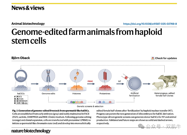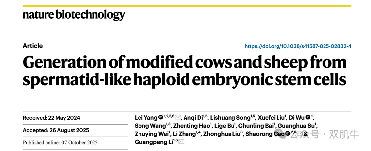 2025年10月7日,内蒙古大学杨磊教授、李光鹏教授与同济大学高绍荣院士团队合作在Nature大子刊《Nature Biotechnology》(IF=41.7,IF5=59.5)发表题为“Generation of modified cows and sheep from spermatid-like haploid embryonic stem cells”研究论文,在大动物生物育种领域取得重大突破性进展。该研究创新性建立了“孤雄单倍体干细胞(haESCs)+‘类精子’表观修饰(spermatid-like)+非整合引导编辑(ePE)”三位一体的单倍体育种策略,不仅破解牛、羊单倍体干细胞建系和应用核心痛点,更成功培育出MSTN基因编辑牛羊,为反刍动物育种开辟全新路径。此外,杂志同期刊还发了「News & Views」评论文章,重点推荐介绍了这项工作。