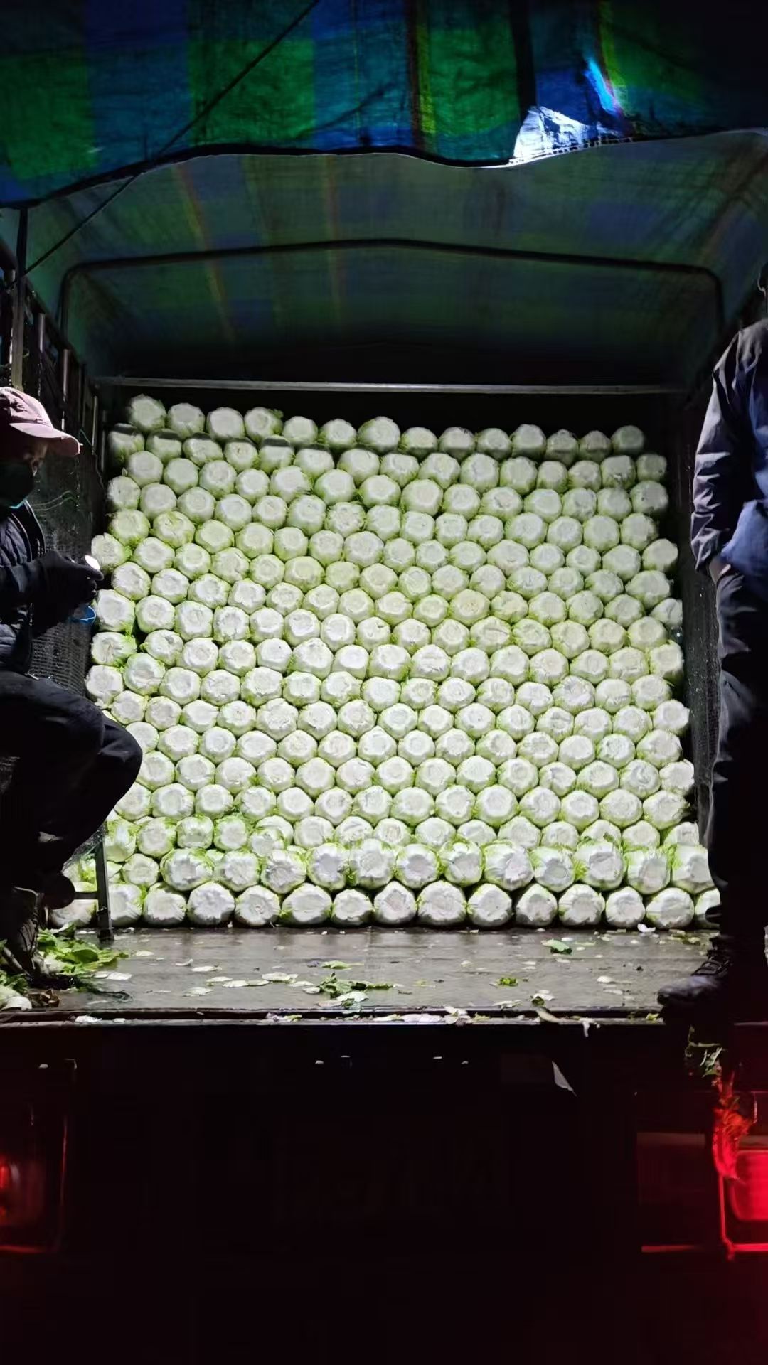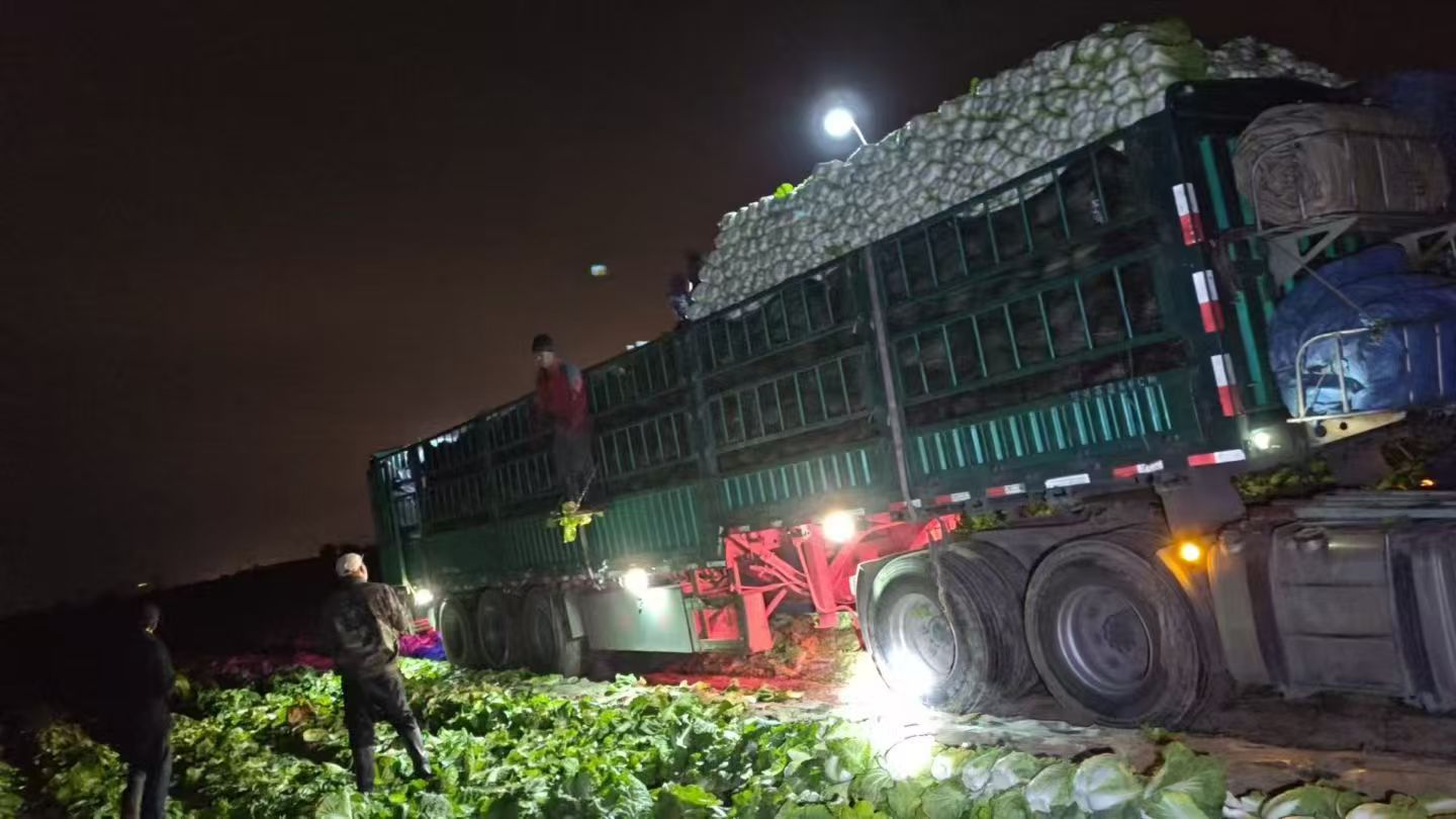 今年的大白菜收获季,遇到霜冻天气。为了避免天气影响,农户们连夜采收,迅速装车发往外地。