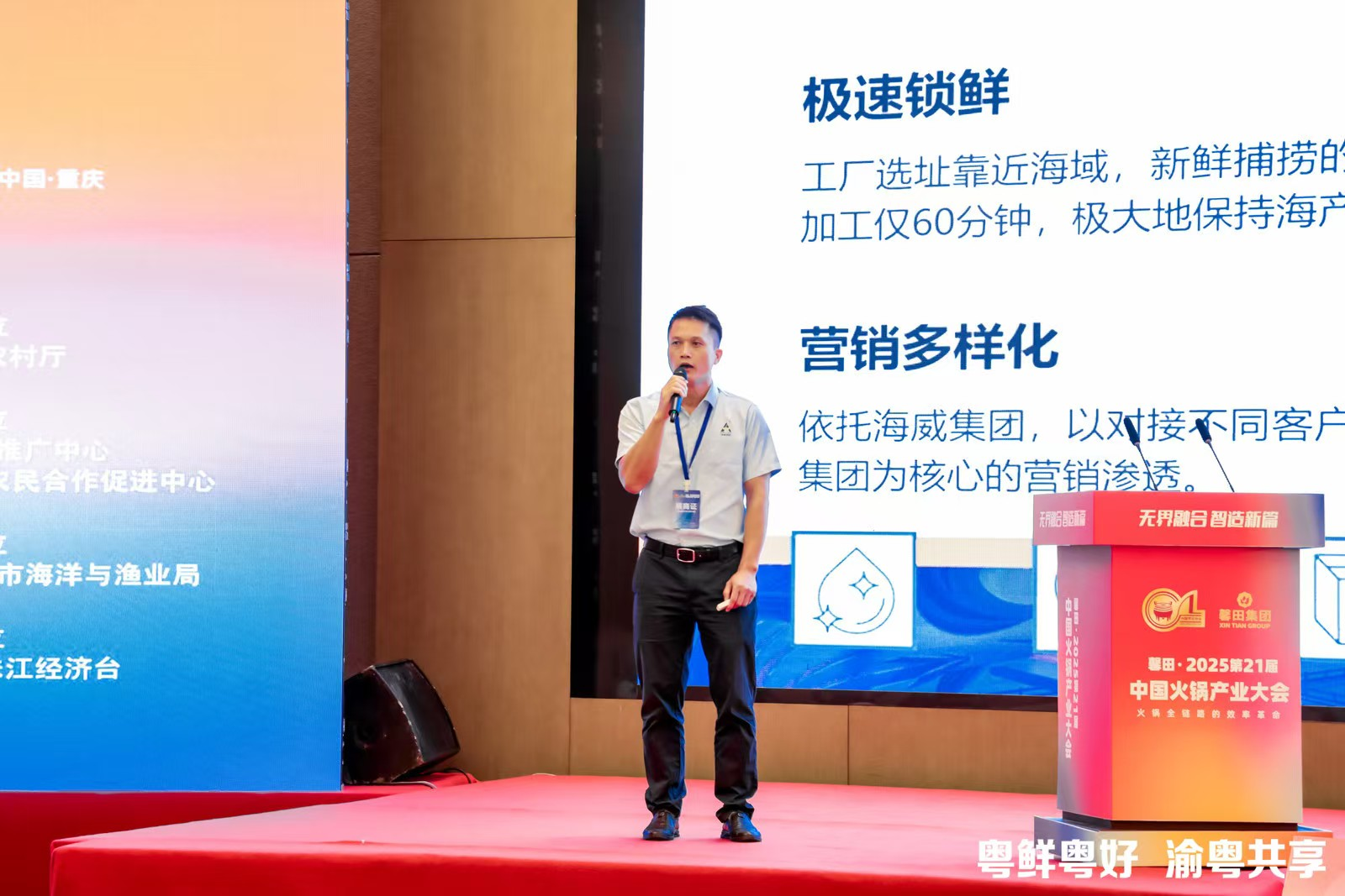 活动现场,广东现代化海洋牧场区域公用品牌“广东鲜品”与多家广东现代化海洋牧场企业集体亮相,全面展示了广东鲜品的卓越品质和在火锅场景中的广泛适配性。广东恒兴集团有限公司产品总监林志明提到,企业通过技术改造提升金鲳鱼的鲜味,优化后的金鲳鱼产品近两个月在西南市场的销量突破8000件,更在此次活动中获得了多家火锅企业的青睐。广东海威农业集团有限公司销售总监陆日宝介绍,为让金鲳鱼更好地契合重庆火锅的吃法,他们在产品处理上做了针对性创新,先对金鲳鱼进行拉花处理,再去头去尾,最终切成一厘米厚的鱼生片,满足消费者对火锅食材“快涮、鲜吃”的需求。