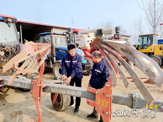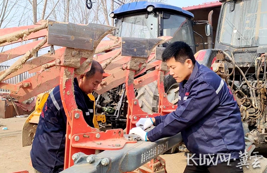 刘铁钧(右)和农机手一起保养维修农机具。长城网·冀云客户端记者 祝雪娟 摄