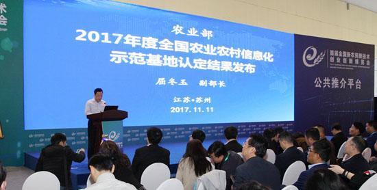 本网讯 11月11日,在首届全国新农民新技术创业创新博览会上,农业部举办农业农村信息化发展成果发布活动,有104家单位被认定为2017年度全国农业农村信息化示范基地,38家单位被确定为农业农村大数据实践案例,并分享了“互联网+”特色产业扶贫调研的初步成果。农业部副部长屈冬玉出席并讲话。