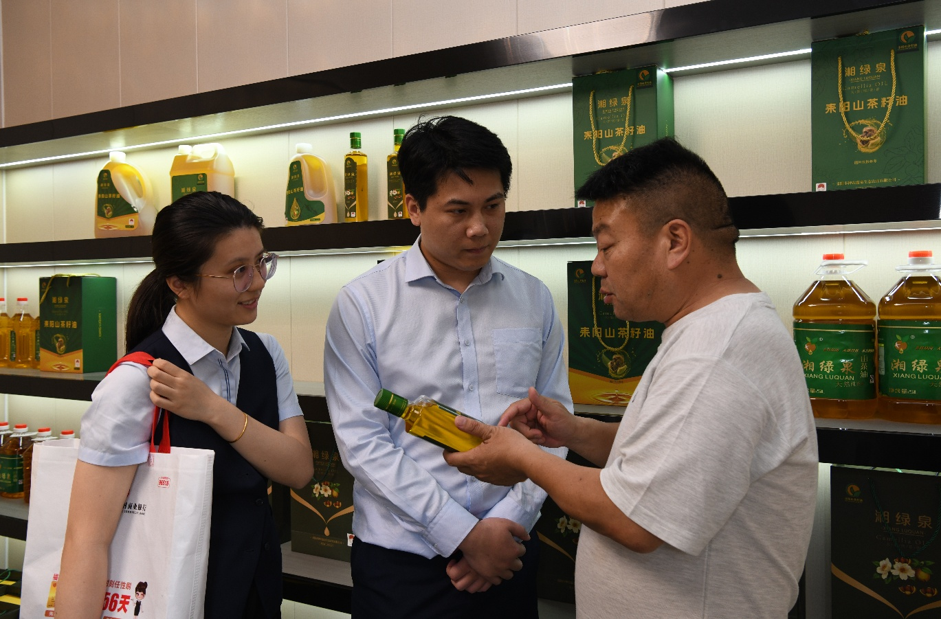 (油茶专业合作社负责人为该行走访入户人员介绍茶油生产和销售情况)