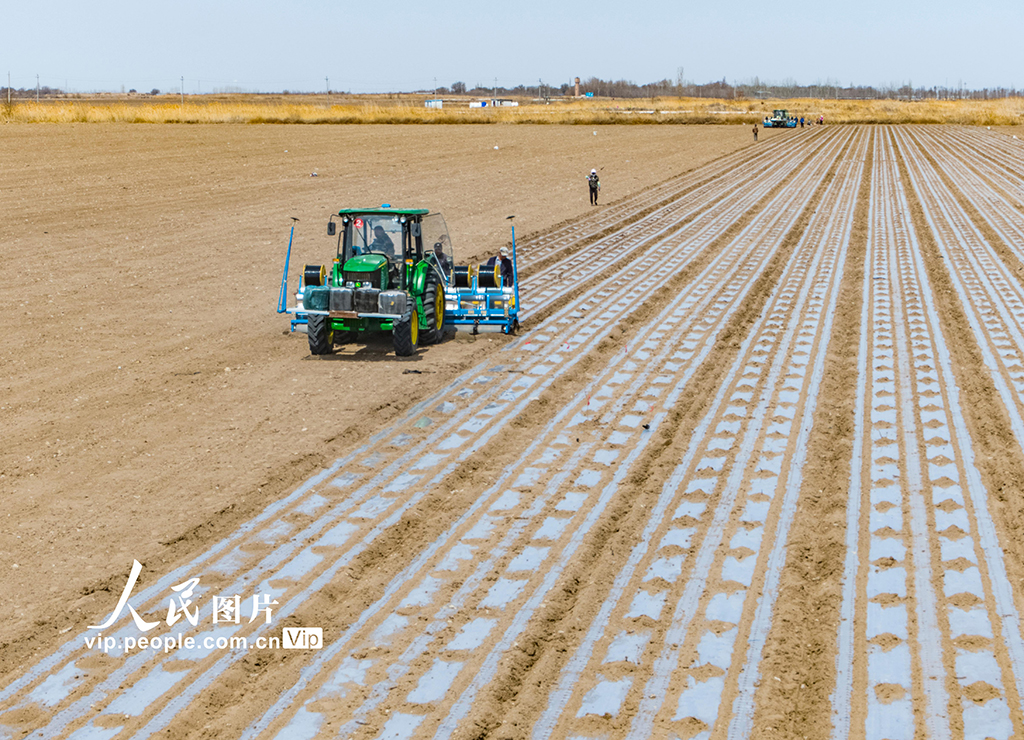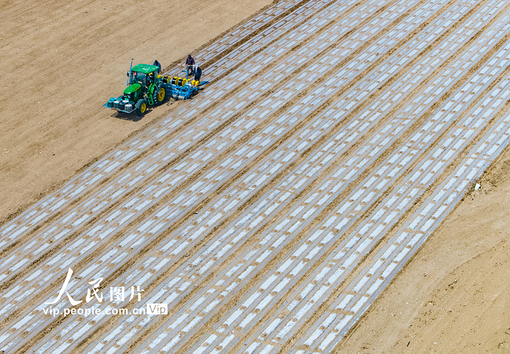 4月15日,新疆昌吉州玛纳斯县北五岔镇大庙村,农户在用北斗卫星导航无人驾驶拖拉机播种棉花。新疆昌吉大力推广卫星导航、无人机飞防、智能施肥机等精细整地、精量播种、精确植保农机化新技术新机具,提高春耕生产农机作业质量和作业效率。同时,大力开展各项农业专业技术培训,全力确保棉花丰产丰收。何龙摄(人民图片网)