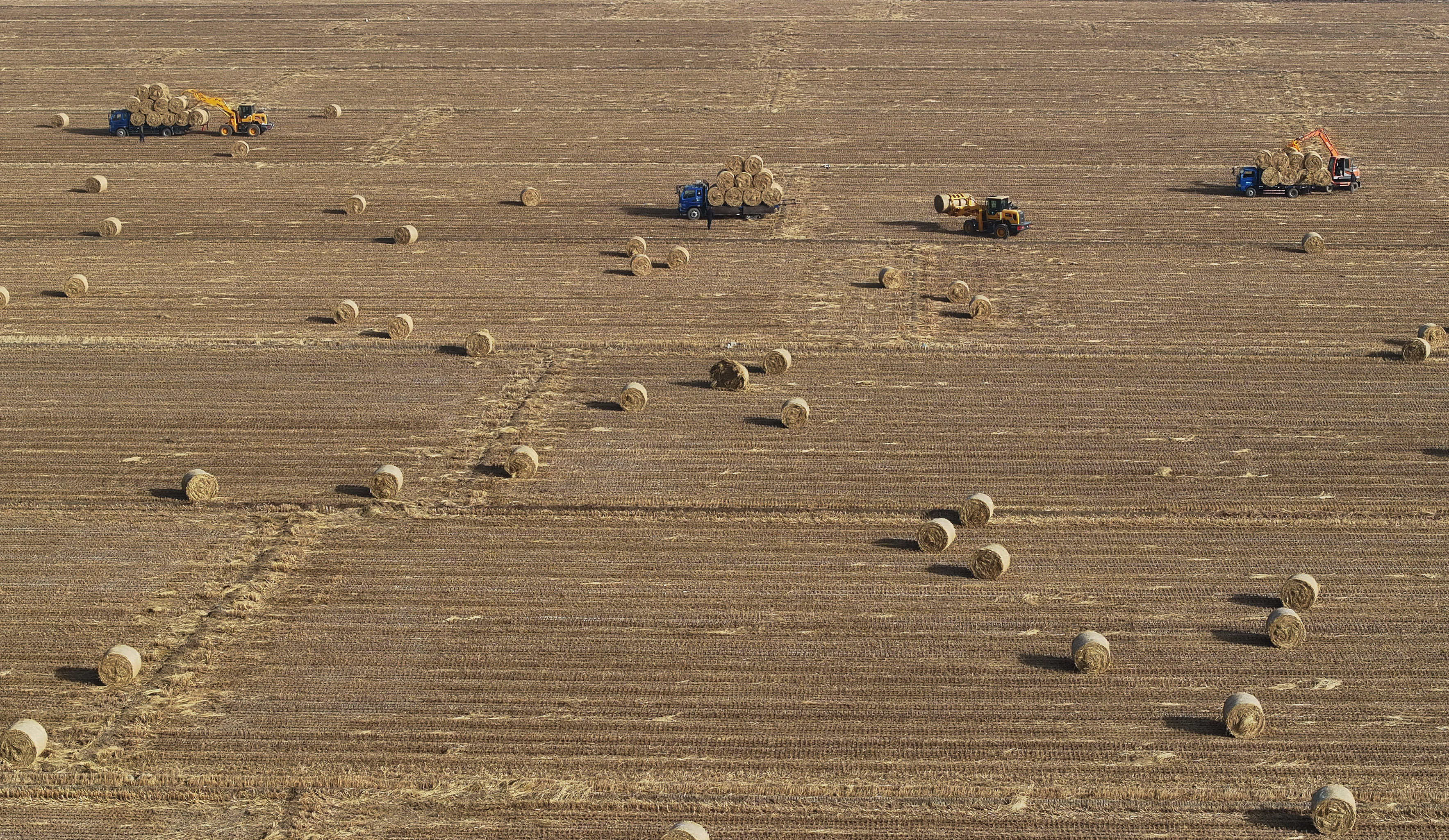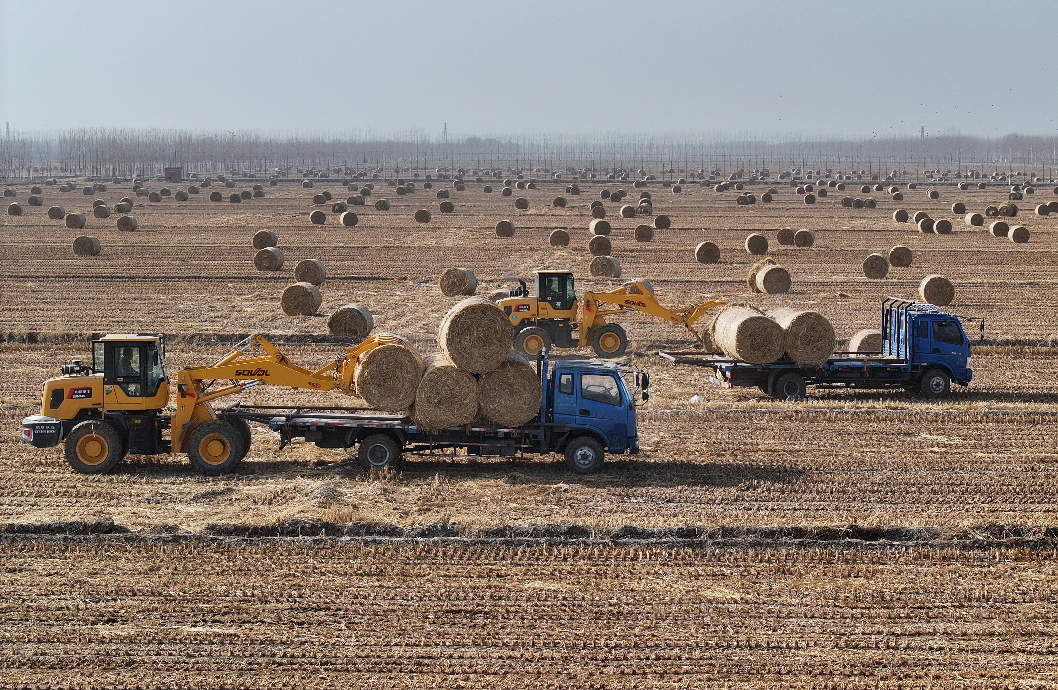 12月10日,在唐山市曹妃甸区第八农场田间,稻草回收企业的工人将打好捆的稻草装车(无人机照片)。