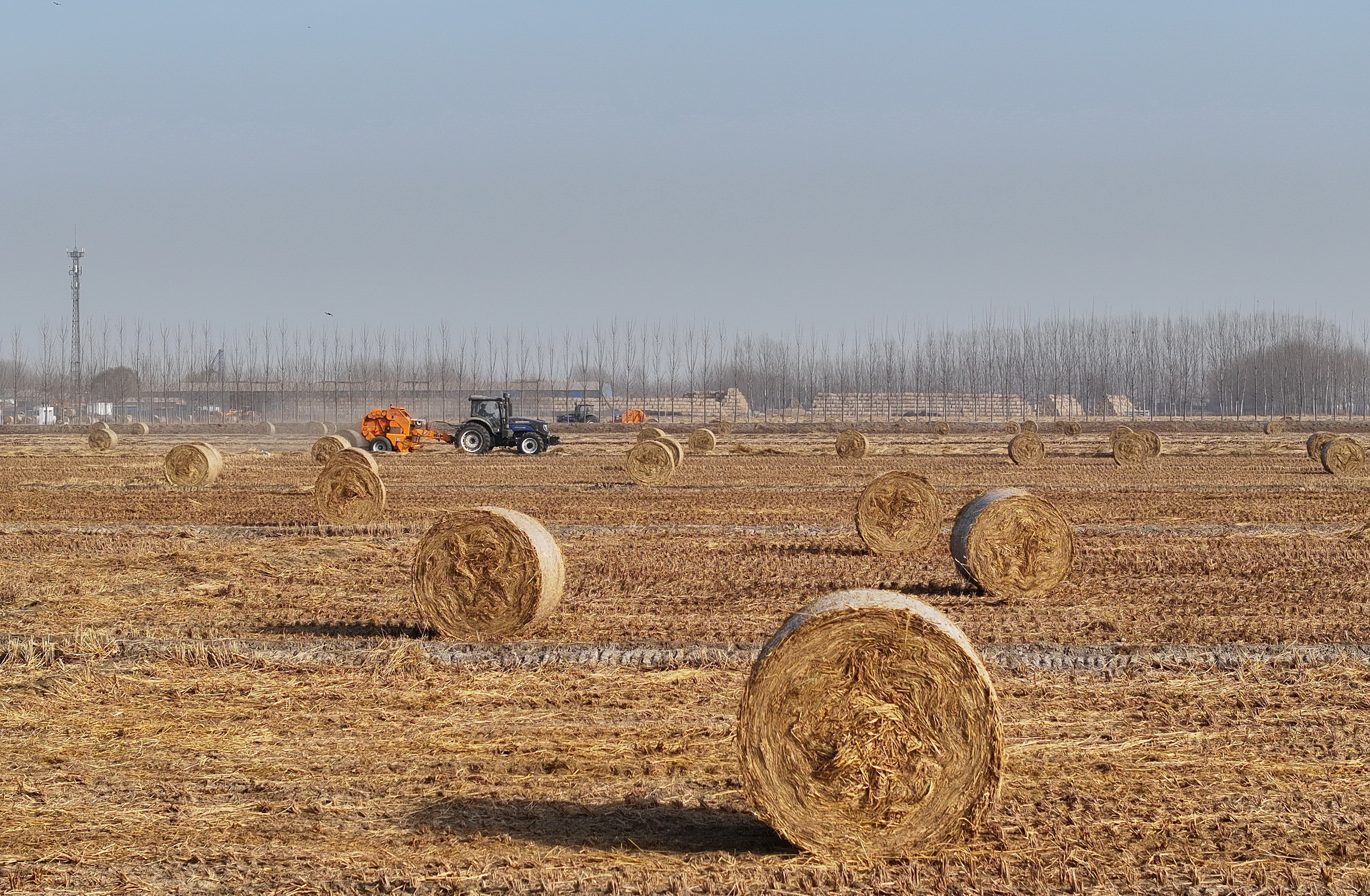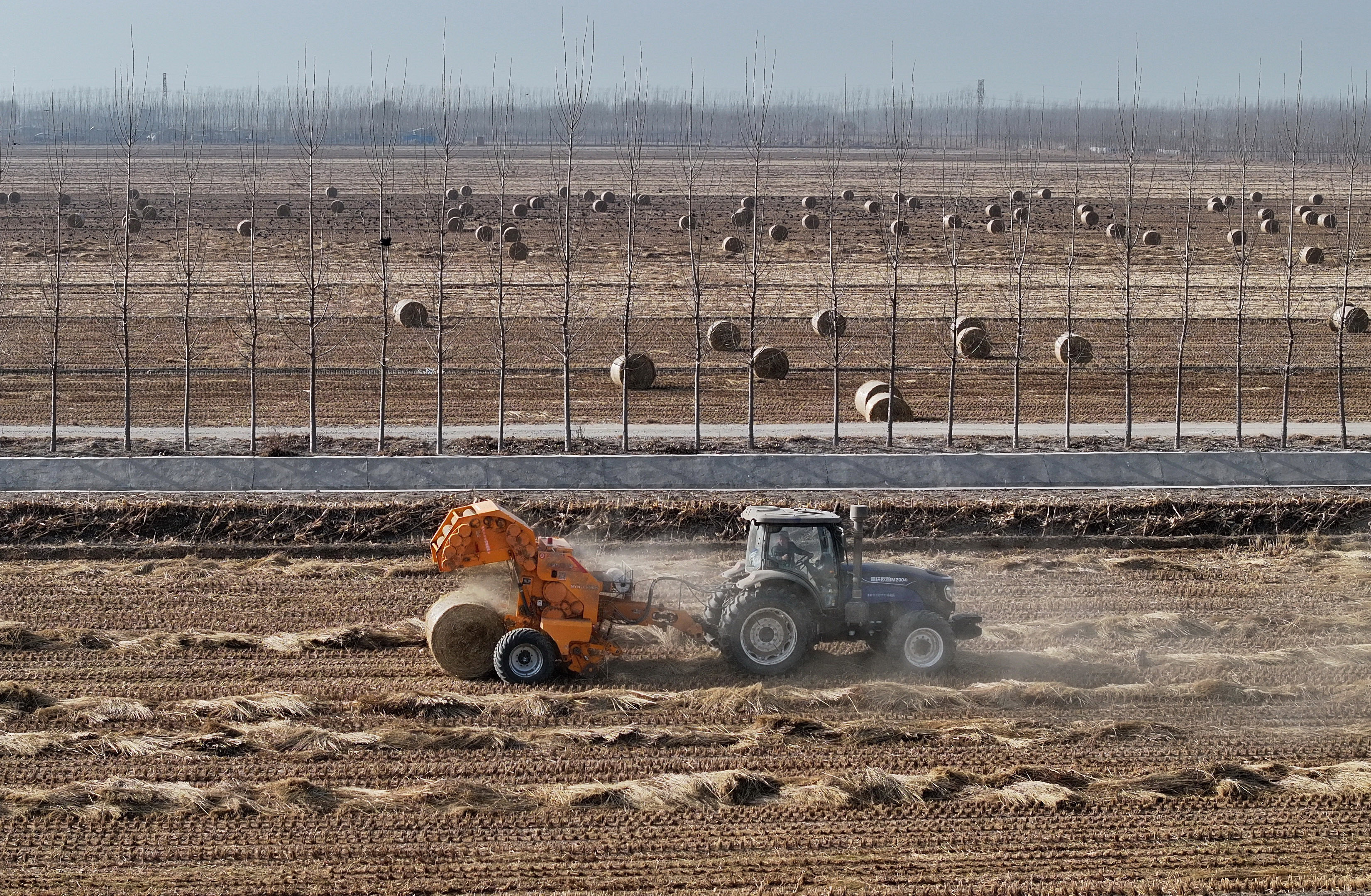12月10日,在唐山市曹妃甸区第八农场田间,农机手驾驶农机将稻草回收打捆(无人机照片)。