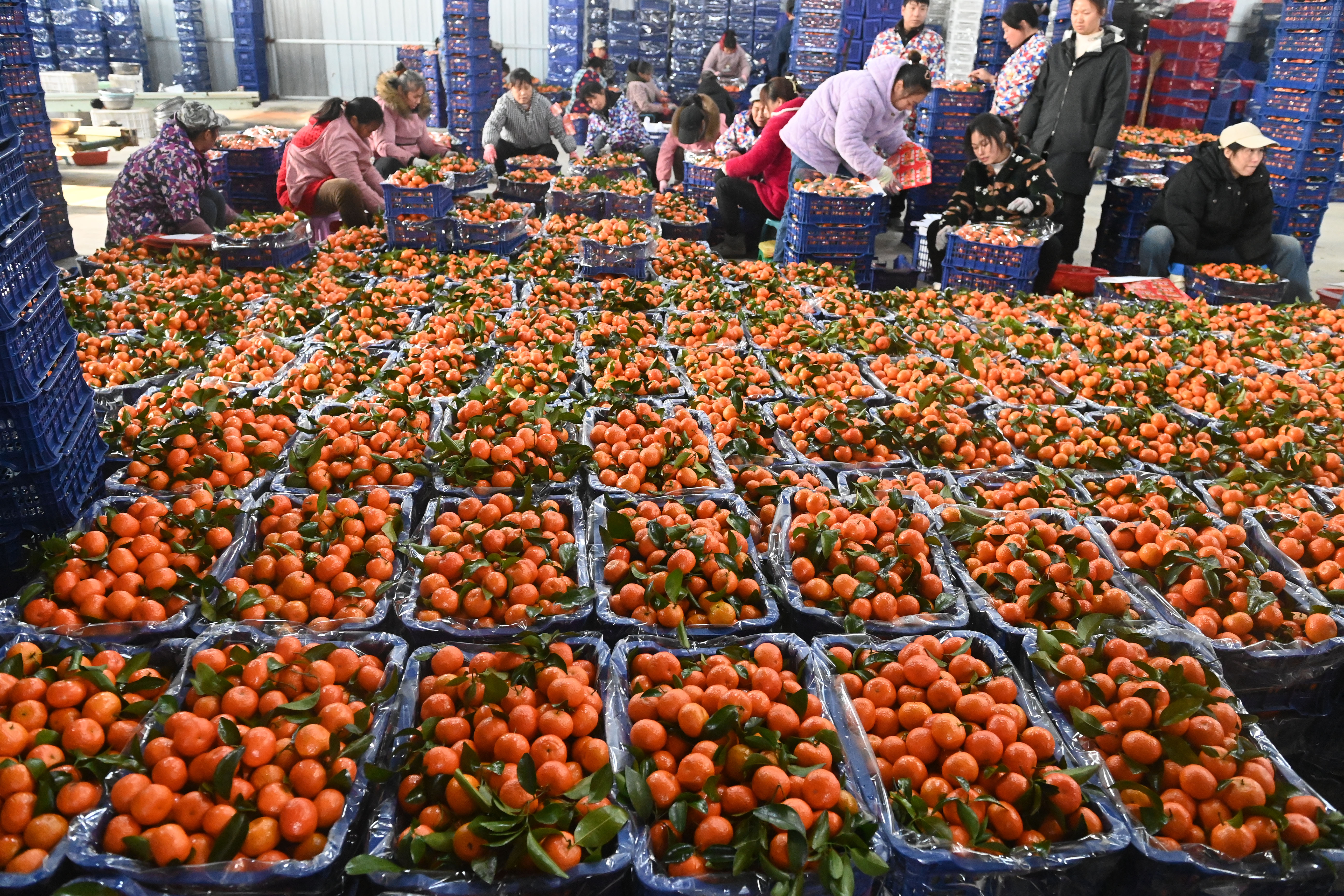 1月23日,在广西全州县绍水镇,工人在分拣刚刚采收回来的砂糖橘。