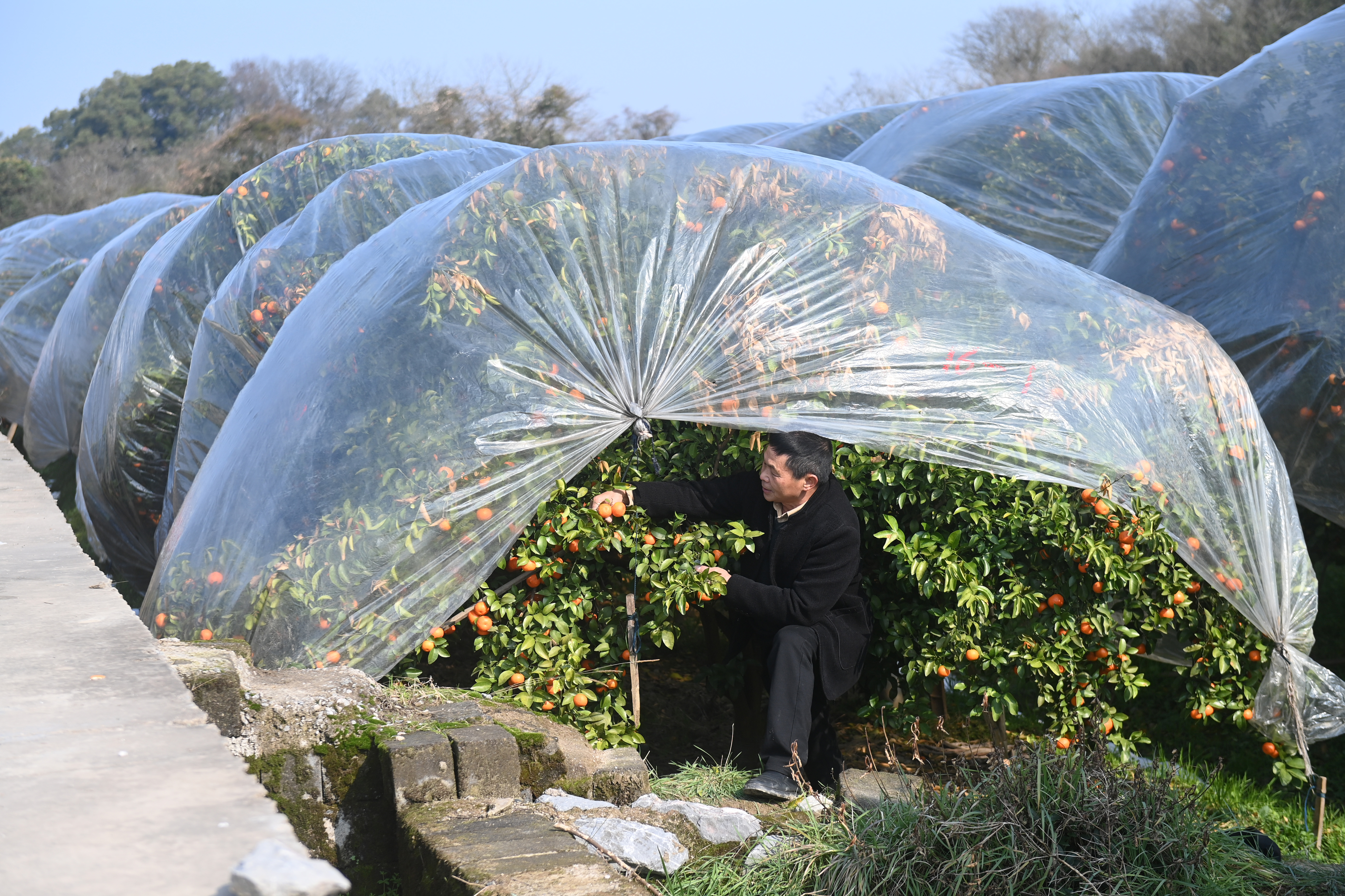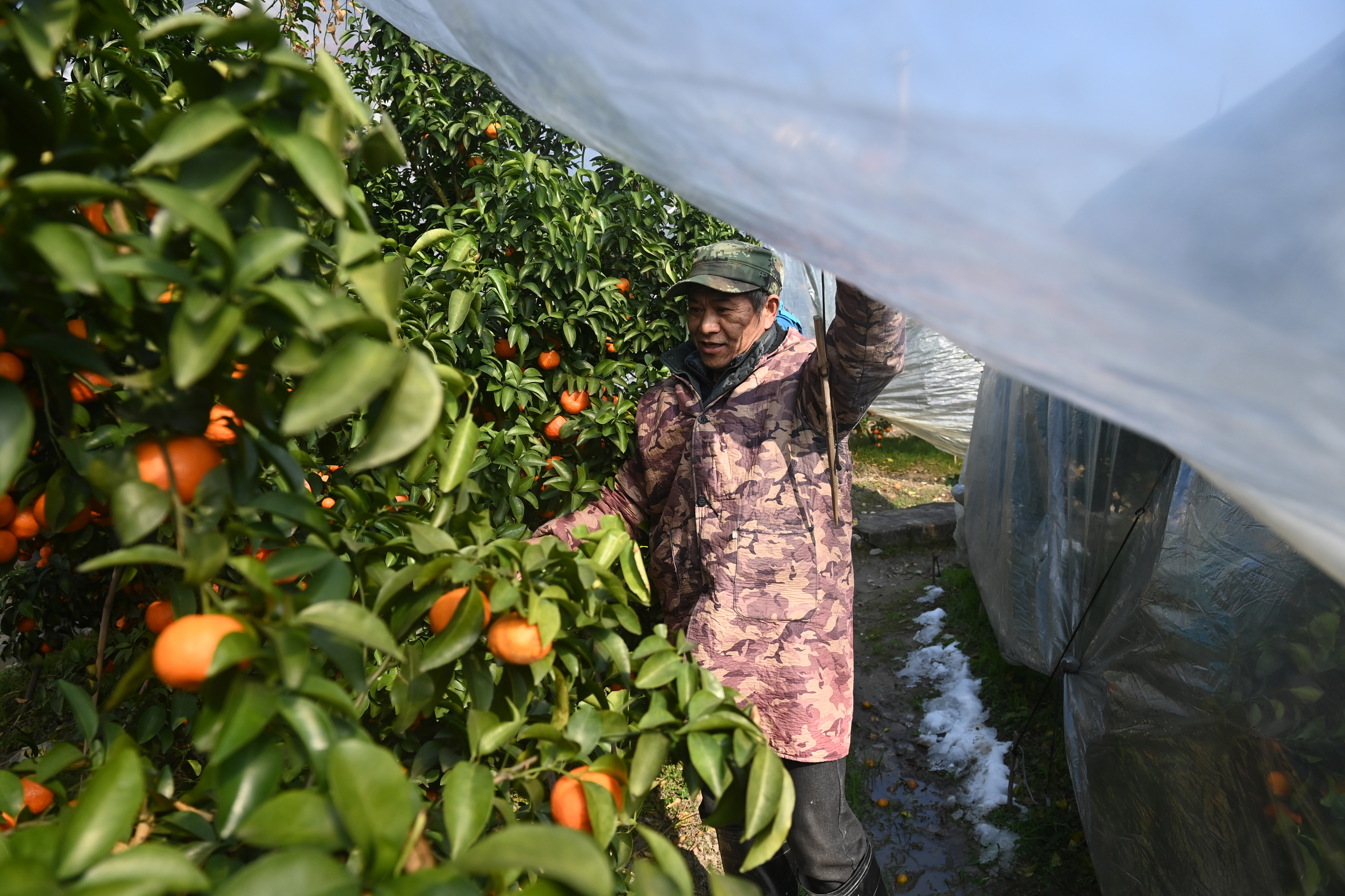 1月23日,在广西全州县绍水镇柳甲村,当地果农在查看保护膜下砂糖橘生长情况。