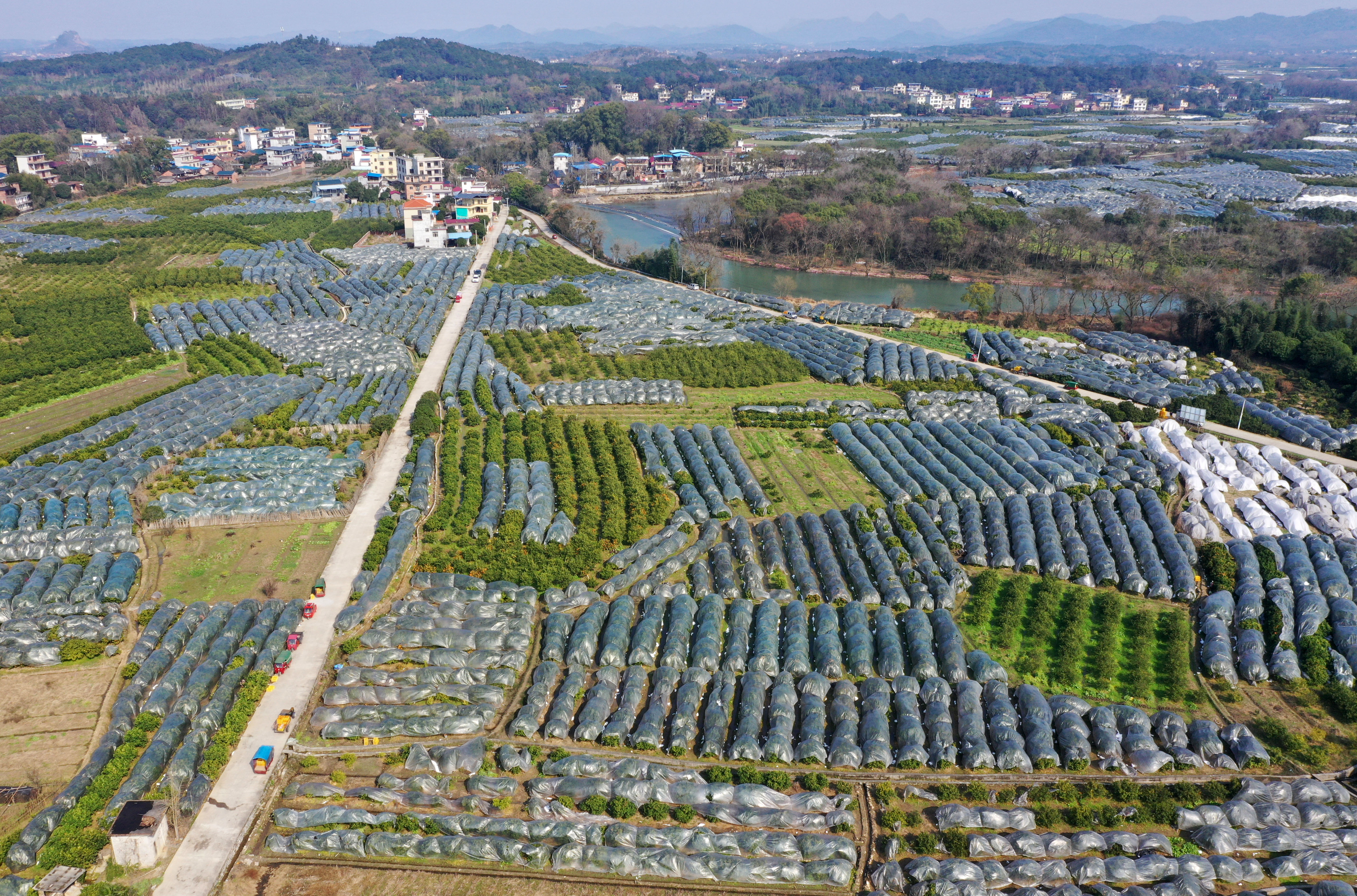 这是广西全州县绍水镇柳甲村覆盖保护膜的砂糖橘基地(1月23日摄,无人机照片)。