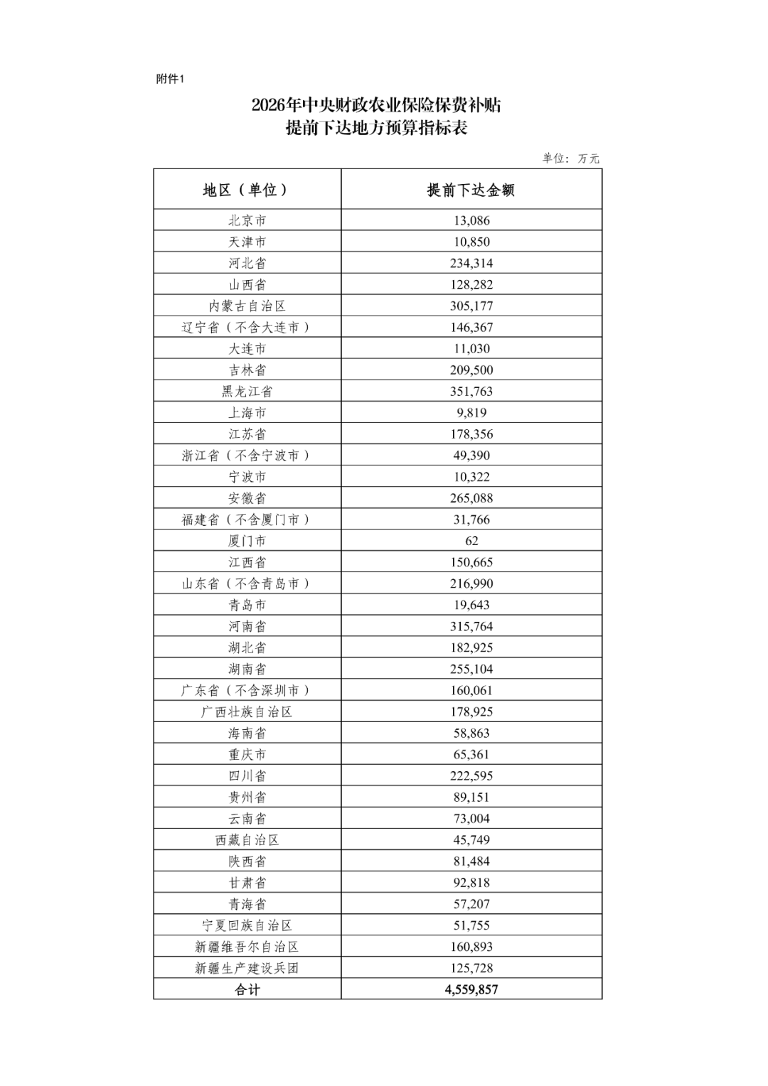 为支持农业保险发展,更好服务保障国家粮食安全,财政部发布通知,提前下达中央财政农业保险保费补贴2026年预算456亿元。