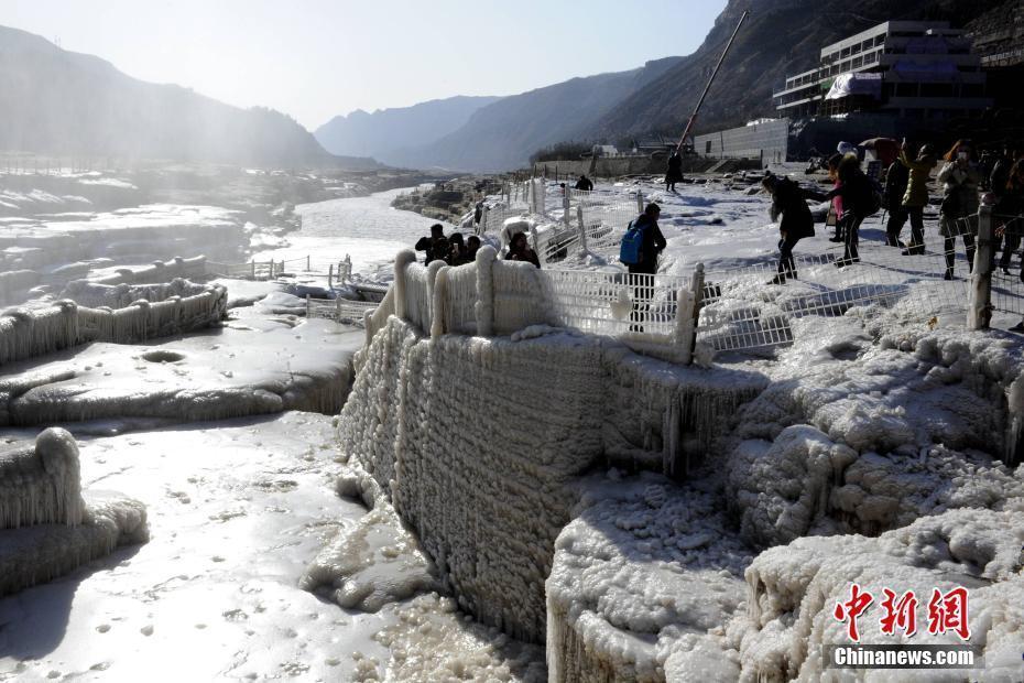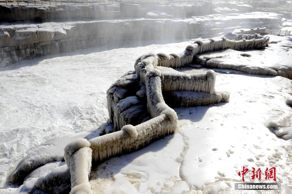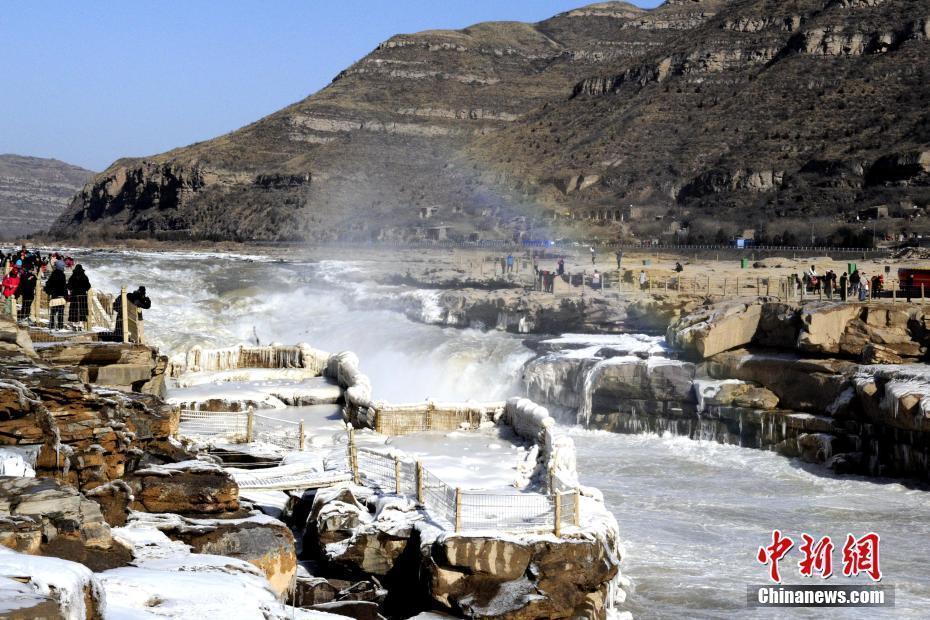 12月19日,当地气温已降至零下10℃。由于冬季黄河水位回落,壶口瀑布河宽收窄,飞流直下,溅起水雾。在阳光的照射下,形成“彩虹通天”的美丽景象。晶莹剔透的冰挂与瀑布上空的彩虹交相辉映。
