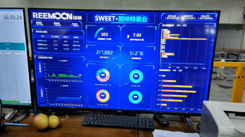 据悉,这条分选线是绿萌联合中科院研发智造的,数字化中控室可随时了解苹果分选数据和入库情况,告别了原来人盯人的模式,可以通过大屏幕随时观察每一条线,每个人的工作效率。是目前国内自动化程度最高的苹果分选线,在国内外众多的竞争厂家中脱颖而出,能够精准、快速地识别出颜色过深苹果暗藏的“软伤”。