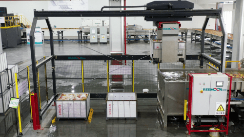 为了让苹果在入池清洗杀菌时不被磕碰伤,绿萌利用机械臂将成框的苹果送入清洗池后再进行180°翻箱,很好的保护了苹果“娇嫩的皮肤”。
