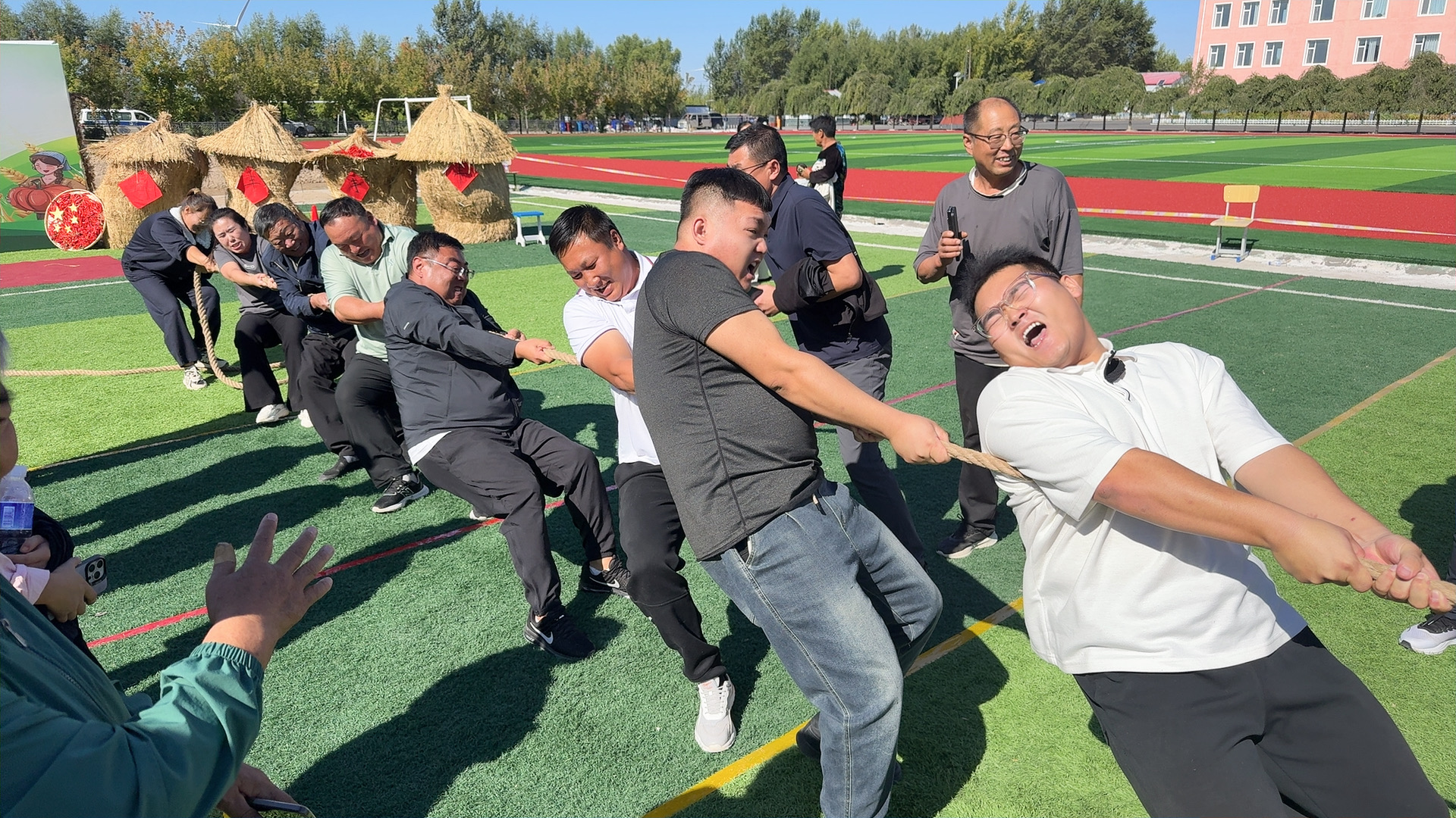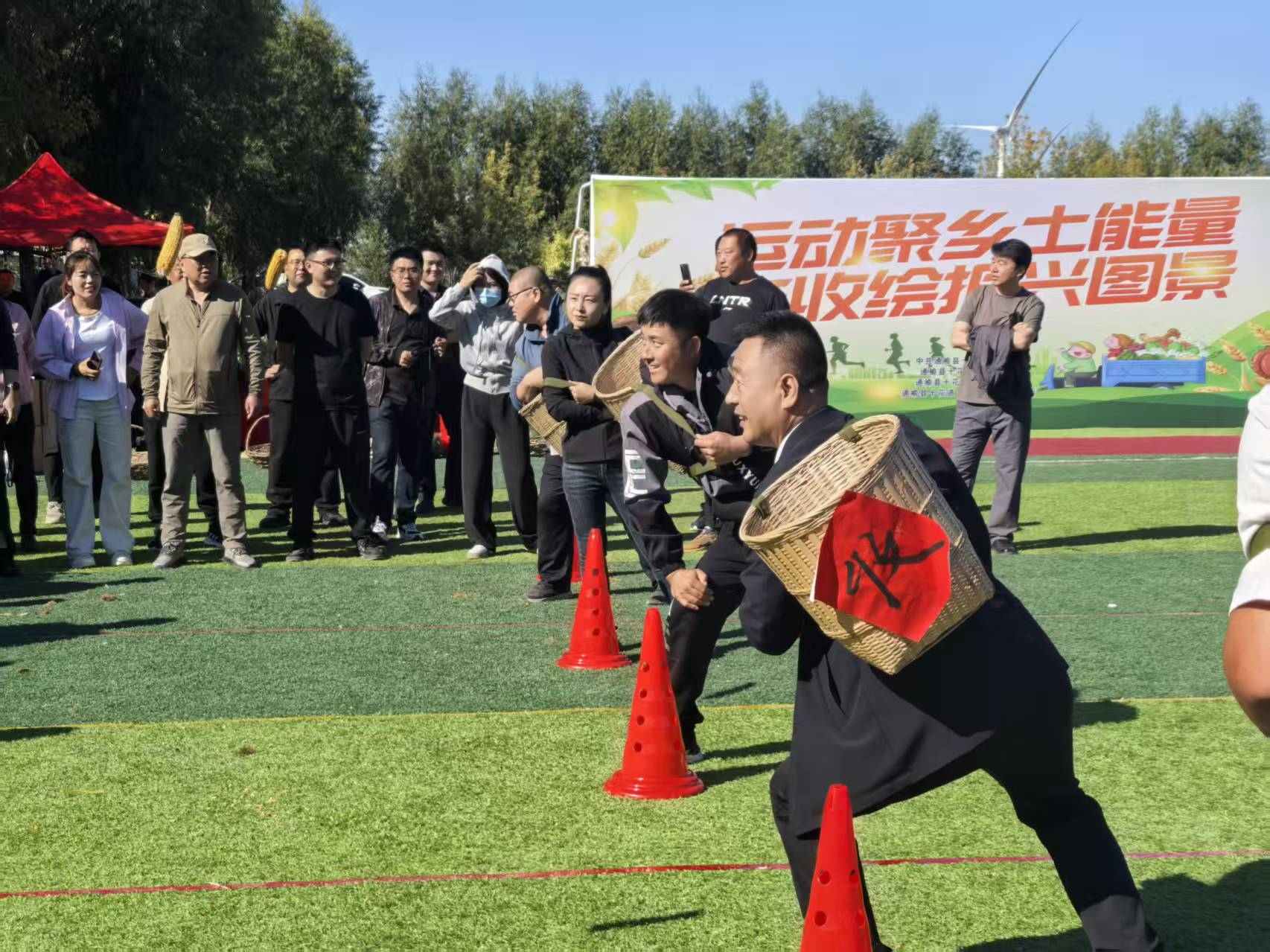 乡学校的运动场上,“运动聚乡土能量,丰收绘振兴图景”的牌子格外醒目,与迎风飘扬的国旗和盛满玉米、南瓜的土筐相映成趣。晒谷场上的金黄稻谷还泛着光,选手们脚下的运动鞋沾着泥土——乡里年轻小伙与村里老党员并肩冲刺,身后传来“加油!”的呐喊,混着围墙外晾晒的葵花籽香气传遍校园;拔河赛场更热闹,乡领导班子和村民们自发组队,紧握麻绳的双手攥出力量,有人腰间还别着刚摘的玉米,“刚从地里过来,趁热闹凑一把!”输赢早已不重要,掌心传递的温度、脸上绽放的笑容,成了干群一心的“粘合剂”。平日里少出门的老人,也搬着小板凳来加油,手里还剥着新收的瓜子,“中秋国庆赶一块儿,又赶上丰收,这热闹得凑!”沉寂的乡村因这场“村运”重拾烟火气,更让城区人看见村民丰收的鲜活模样,为后续城乡资源互通、产业合作埋下伏笔。