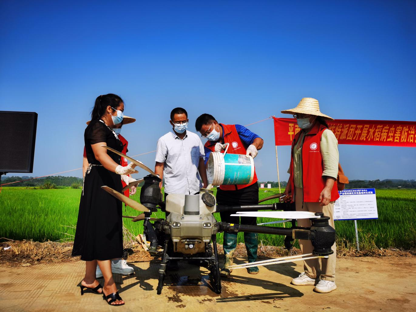 (平南县乡村科技特派员利用无人机开展水稻病虫害防治活动现场 通讯员林益群供图)