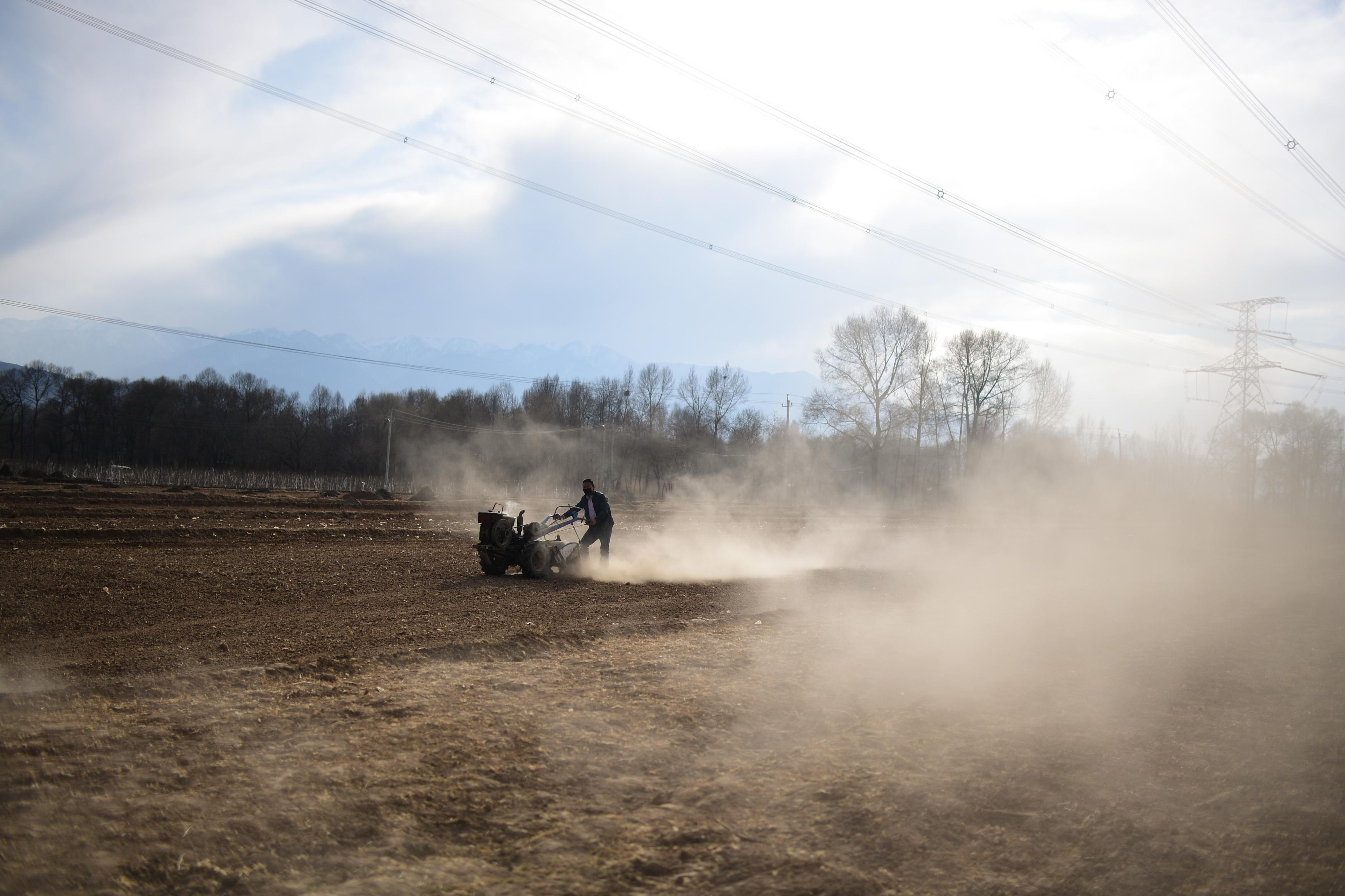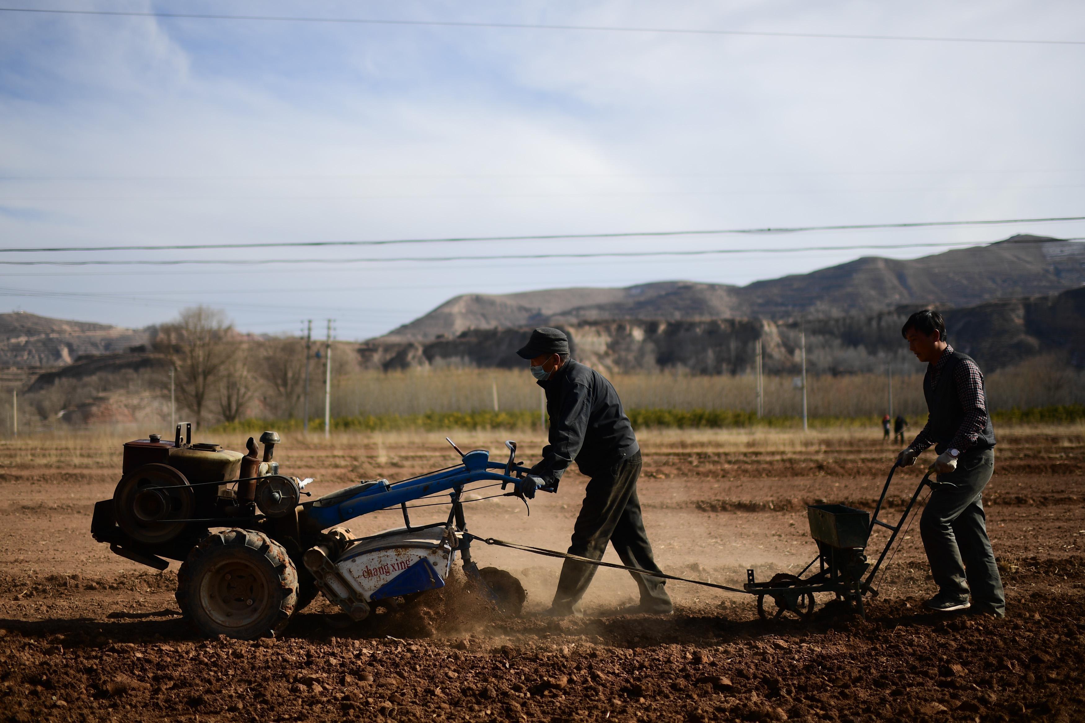 2月10日,青海省民和回族土族自治县中川乡光明村村民在平整农田,准备播种。