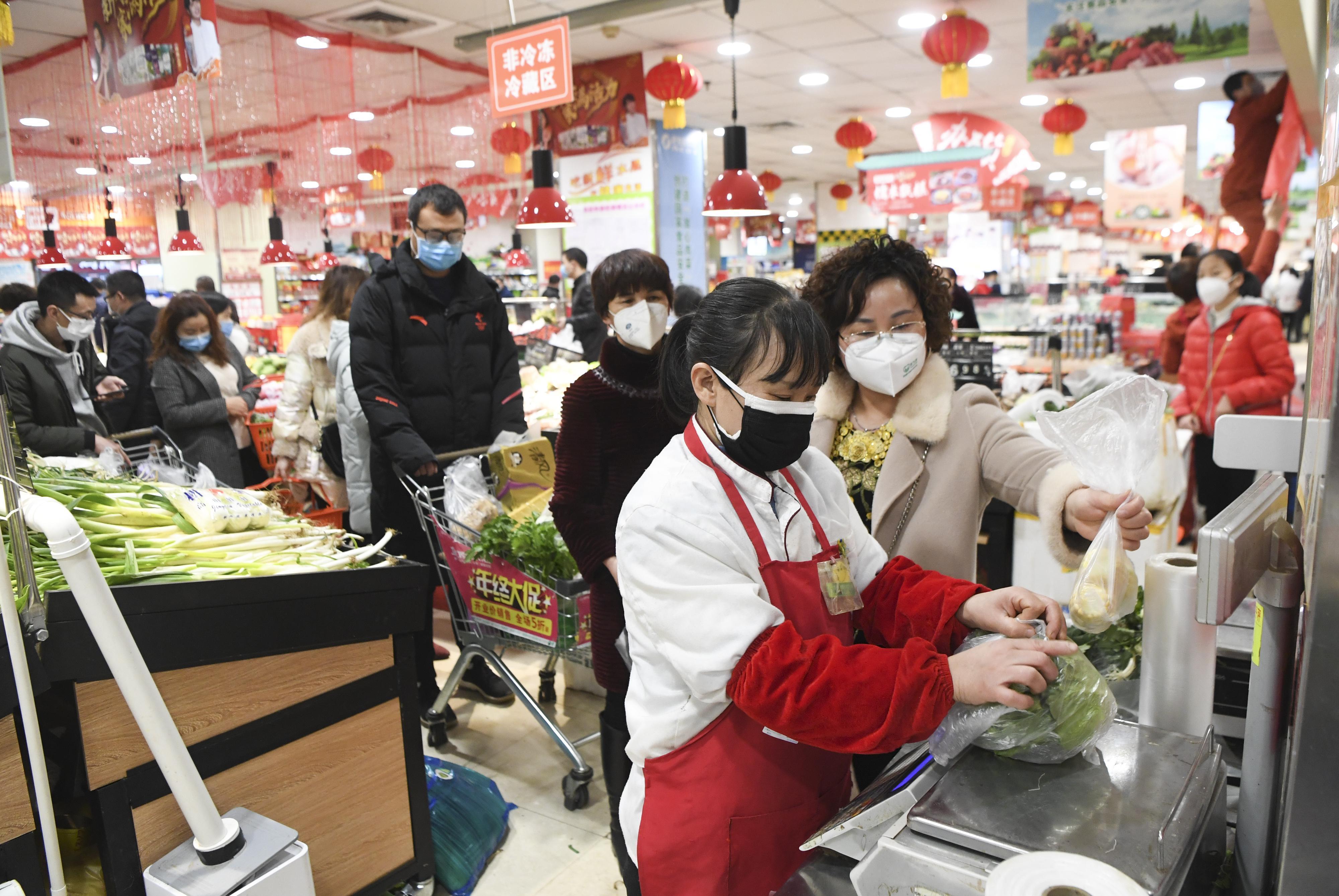 消费者在重庆市云阳县双江街道一家超市内排队称重。