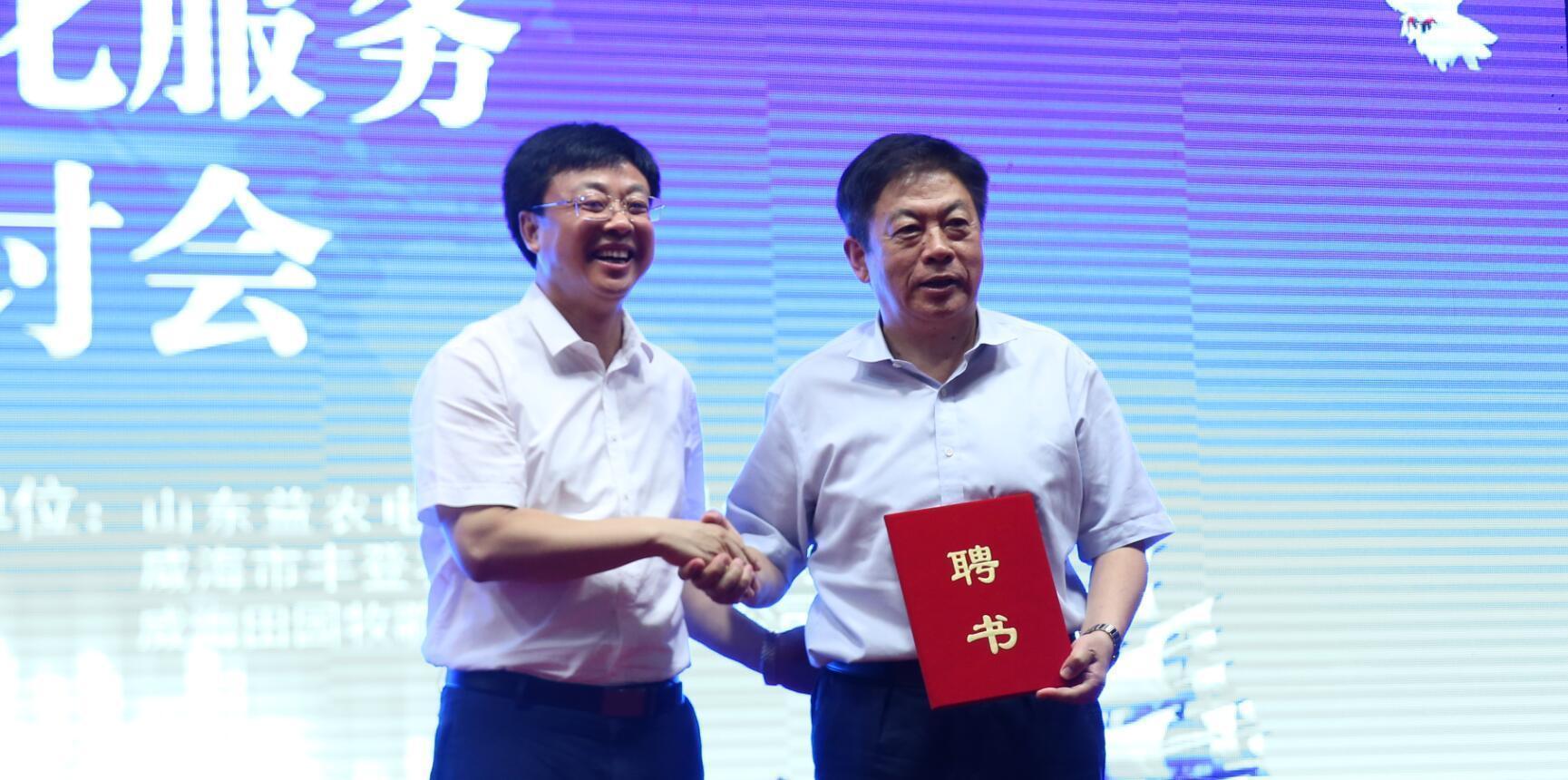 威海市委常委、组织部部长刘运同志为威海市乡村振兴高端智库专家颁发聘书(右为中国合作经济学会会长、原农业部总农艺师孙中华同志)
