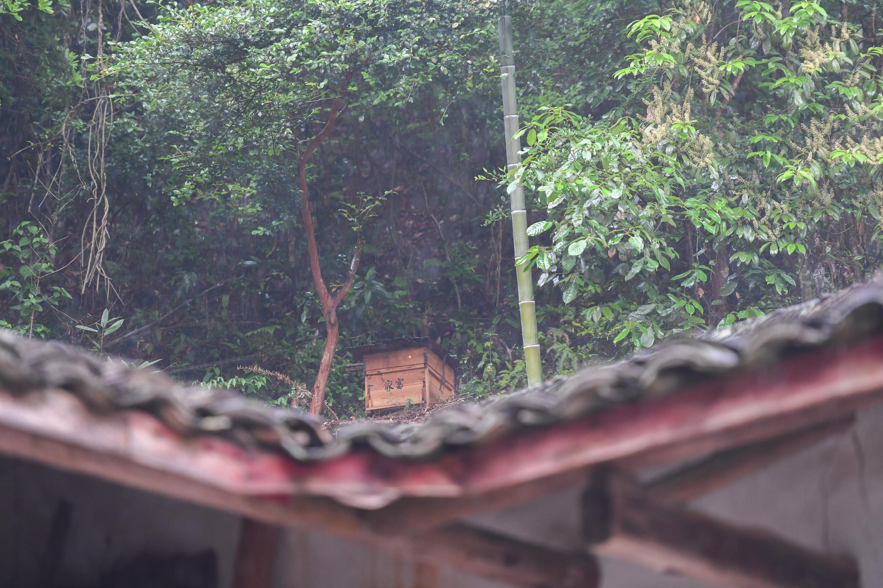 顺着潺潺溪水溯流而上,几乎快到山谷最深处时,就是汪炳生养蜂的地方。见记者走上坡,汪炳生迎了过来。在他身后是一栋年代久远的土楼,房前屋后摆放着不少蜂箱,蜜蜂在林间飞来飞去。