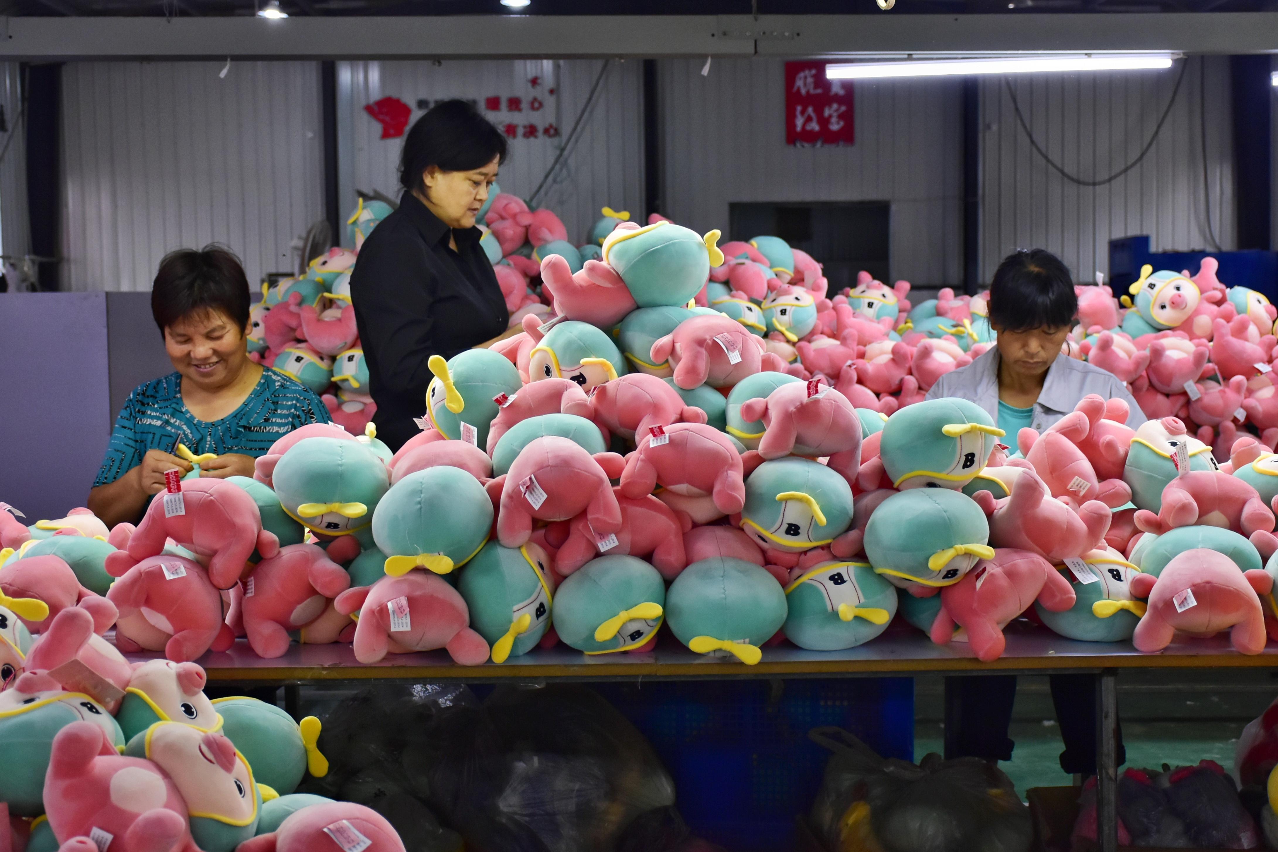 在河南省新安县石井镇山沃村张勤英与人合作投资的毛绒玩具厂内,工人们在工作(8月20日摄)。