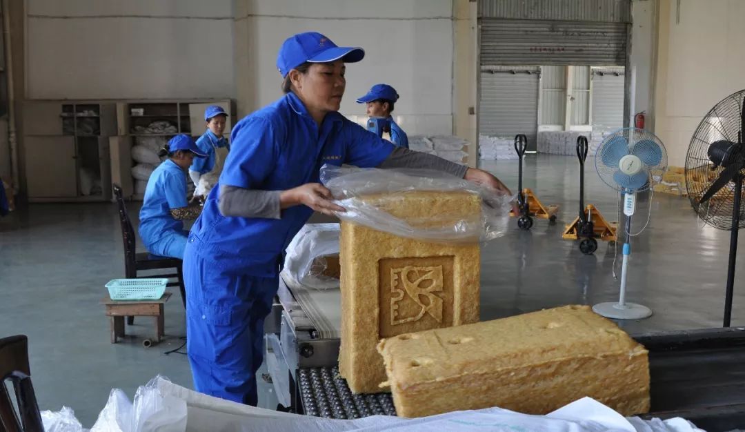 在西双版纳景阳橡胶公司景洪第一制胶厂,全乳胶、标胶生产线正在有序运转。这里推行标准化管理,收集到的胶乳经过净化除杂后,被导入长长的凝固槽内。凝固的胶乳通过机械滚压、脱水,变为较薄、厚度一致的凝块。车间另一侧,工作人员正在对压制成型的胶块进行包装前的质量检验。