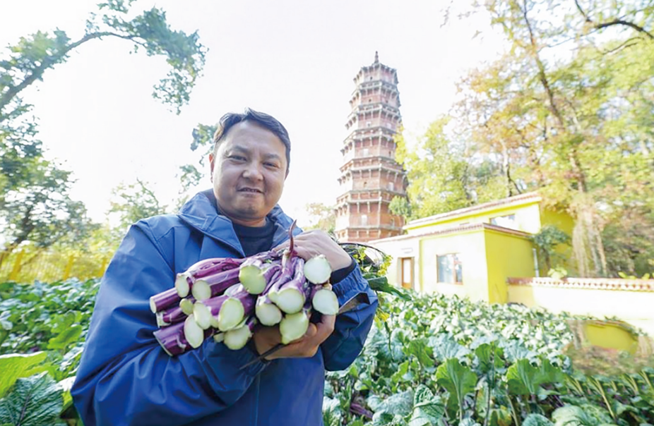 伫立在宝通禅寺的禅耕园里,俯身下去,便是紫色洪山菜薹的生机勃勃,仰头望去,则是高塔钟声的厚重隽永。塔影钟声之中,很容易领会到洪山菜薹为何能被称为“味尤佳,它处皆不及”的“独一档”。