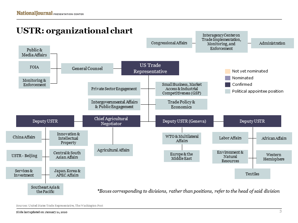美国贸易代表办公室的前世今生。随着关税与贸易总协定(GATT)等多边贸易谈判工作的推进,国际谈判的规模和重要性不断提升,1962年美国国会通过了《1962年贸易扩大法》,提出建立跨部门的机构为国际贸易谈判提供政策咨询。1963年,时任总统肯尼迪建立了“贸易特别代表办公室”(Office of Special Trade Representative,简称STR),并在华盛顿特区和瑞士日内瓦分设两个代表处。20世纪60年代,STR代表美国参加关税与贸易总协定(GATT)肯尼迪回合多边贸易谈判,较出色地完成了谈判任务,鉴于此,美国国会在《1974年贸易法》条款中,从法律上正式承认了STR的地位,并规定该机构作为美国总统行政办公室的组成单位,直接对总统和国会负责。1979年STR根据《贸易协议法》进行了重组,在职责范围以及管理结构等方面都进行了较大的变革,进一步强化了其在国内政策制定和国际贸易谈判方面的作用。随后贸易特别代表改称为美国贸易代表,机构名称确定为“美国贸易代表办公室”(Office of the United States Trade Representative,简称USTR)。随着国际贸易形势的飞速发展,1988年国会在《综合贸易竞争法》中对USTR的职责范围予以修改和扩充。1994年《乌拉圭回合协议法案》进一步明确USTR负责世界贸易组织(WTO)所有相关谈判。目前,USTR设贸易代表1人、副代表3人、首席农业代表1人,组织架构如图示。
