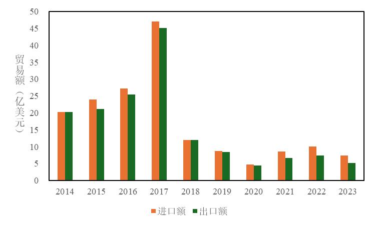 从出口看,我国珍珠出口额从2014年的1.22亿美元下降到2020年的0.16亿美元,2021—2023年珍珠出口水平逐渐恢复,2023年达到0.48亿美元。我国珍珠进出口贸易在2017年和2020年及之后呈现逆差状态,其后逆差逐渐收缩。
