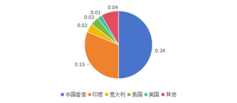 2023年我国前五大出口市场为中国香港、印度、意大利、泰国和美国,出口额分别为0.24、0.14、0.02、0.02、0.01亿美元。其中,中国香港、印度两大市场的占比为81.28%,出口市场集中。