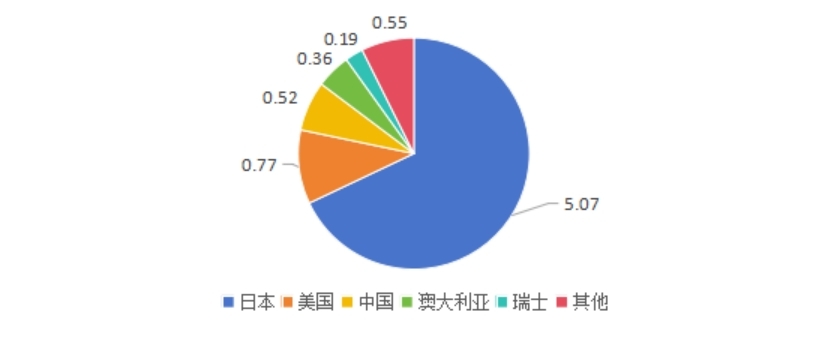 世界珍珠贸易进出口的国别都较为集中。2023年世界珍珠进口7.46亿美元,前五大进口国是日本、美国、中国、澳大利亚和瑞士,进口额分别为5.07、0.77、0.52、0.36、0.19亿美元,占世界珍珠进口规模的92.62%。
