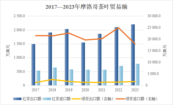 人口仅3000多万的摩洛哥是全球最大的绿茶进口国,其茶叶引入历史可回溯至公元14世纪。1959年,摩洛哥政府创办了国营茶叶和糖办公室(Office National du Théet du Sucre,简称ONTS),统筹茶叶进口、包装、储存与分销。摩洛哥民众钟情于绿茶,惯于在茶汤中添入方糖与薄荷叶,饮用后神清气爽、解渴消暑,堪称国民饮品。2023年,摩洛哥茶叶进口额1.87亿美元,其中绿茶进口额 1.79亿美元,占全球绿茶进口总额的42.3%。摩洛哥不仅是全球最大的绿茶进口国,同时也是重要的茶叶出口国。2023年,摩洛哥茶叶总出口额3854万美元,其中绿茶出口1645.6万美元,红茶出口 2204.9万美元。阿特拉斯山脉高海拔与凉爽气候为茶叶生长营造了绝佳环境,是茶叶种植的理想区域。摩洛哥红茶拥有馥郁香气与醇厚口感,成为该国文化的显著标识,在全球市场有较高的声誉。
