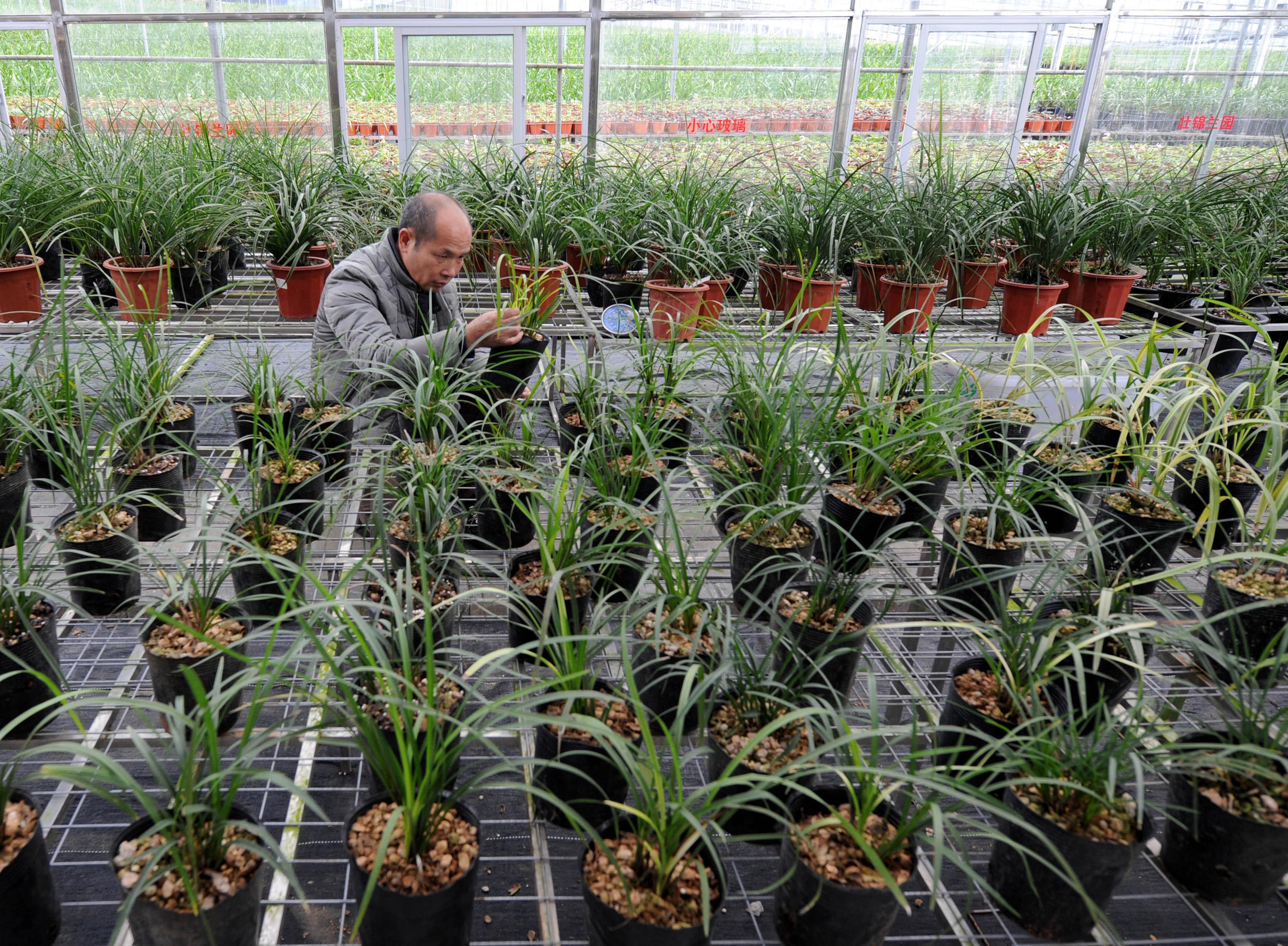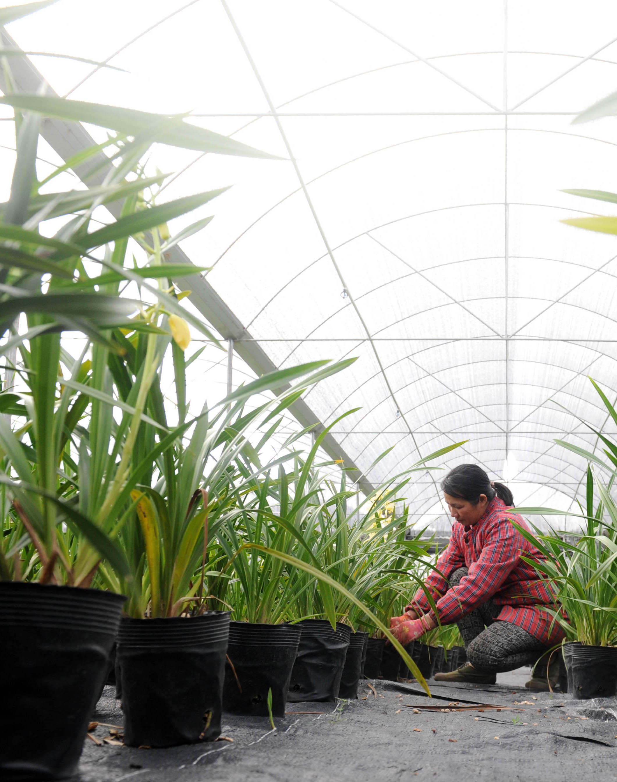 11月28日,荔浦市双江镇永坪村兰花种植示范基地,花农在查看兰花生长情况。