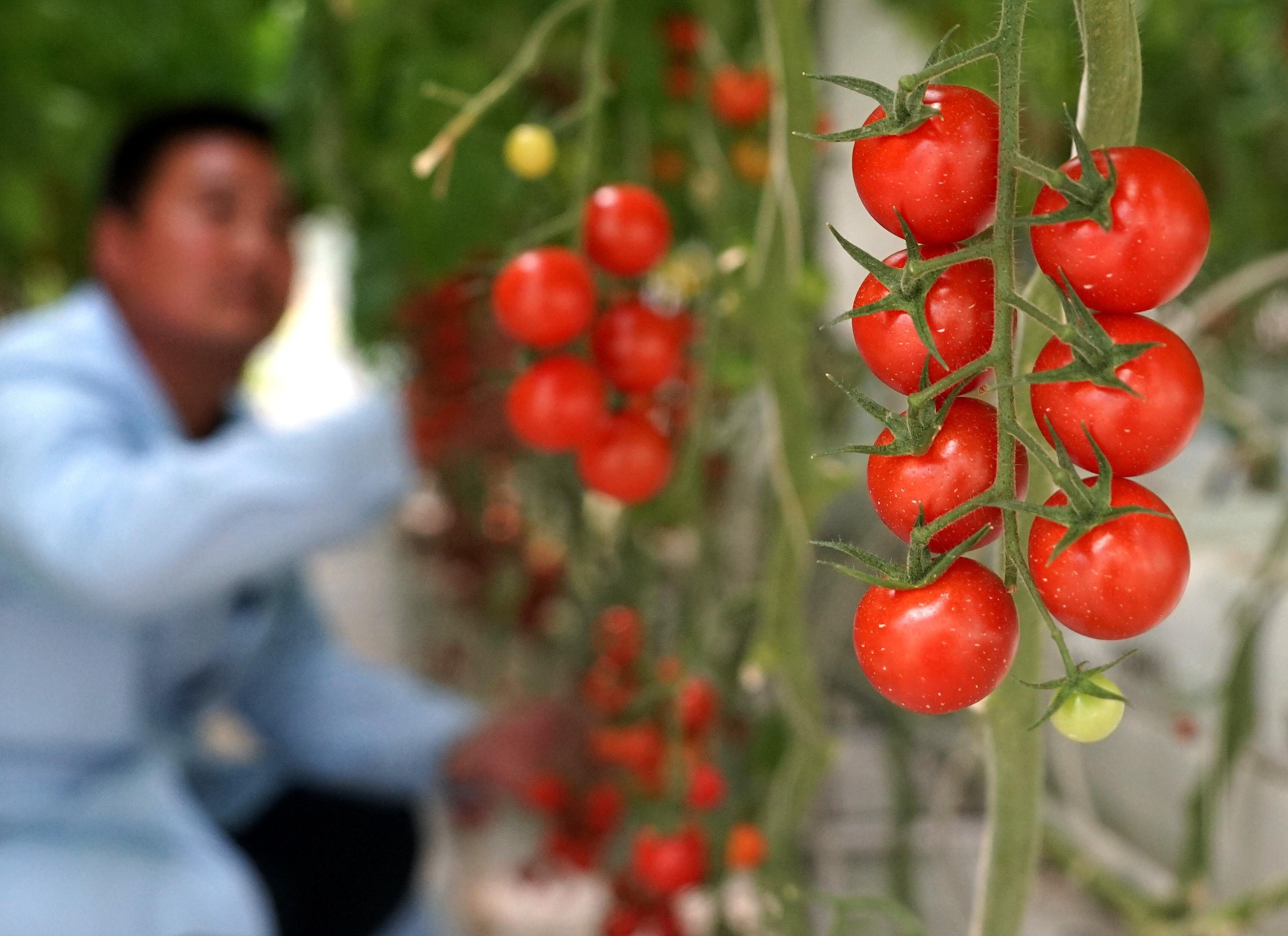 4月15日,工作人员在洛阳市伊川县江左镇一处智能温室内查看小番茄的生长情况。