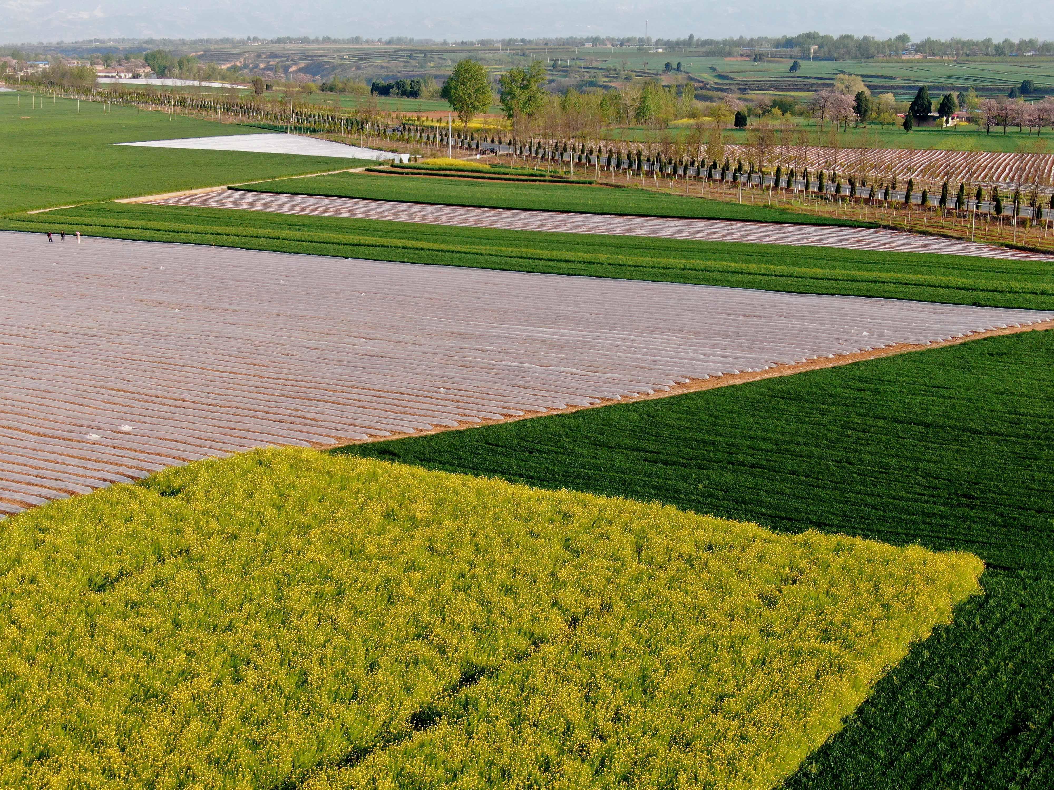 这是洛阳市洛宁县小界乡一处油菜、西瓜、小麦间种的农田(4月13日摄,无人机照片)。