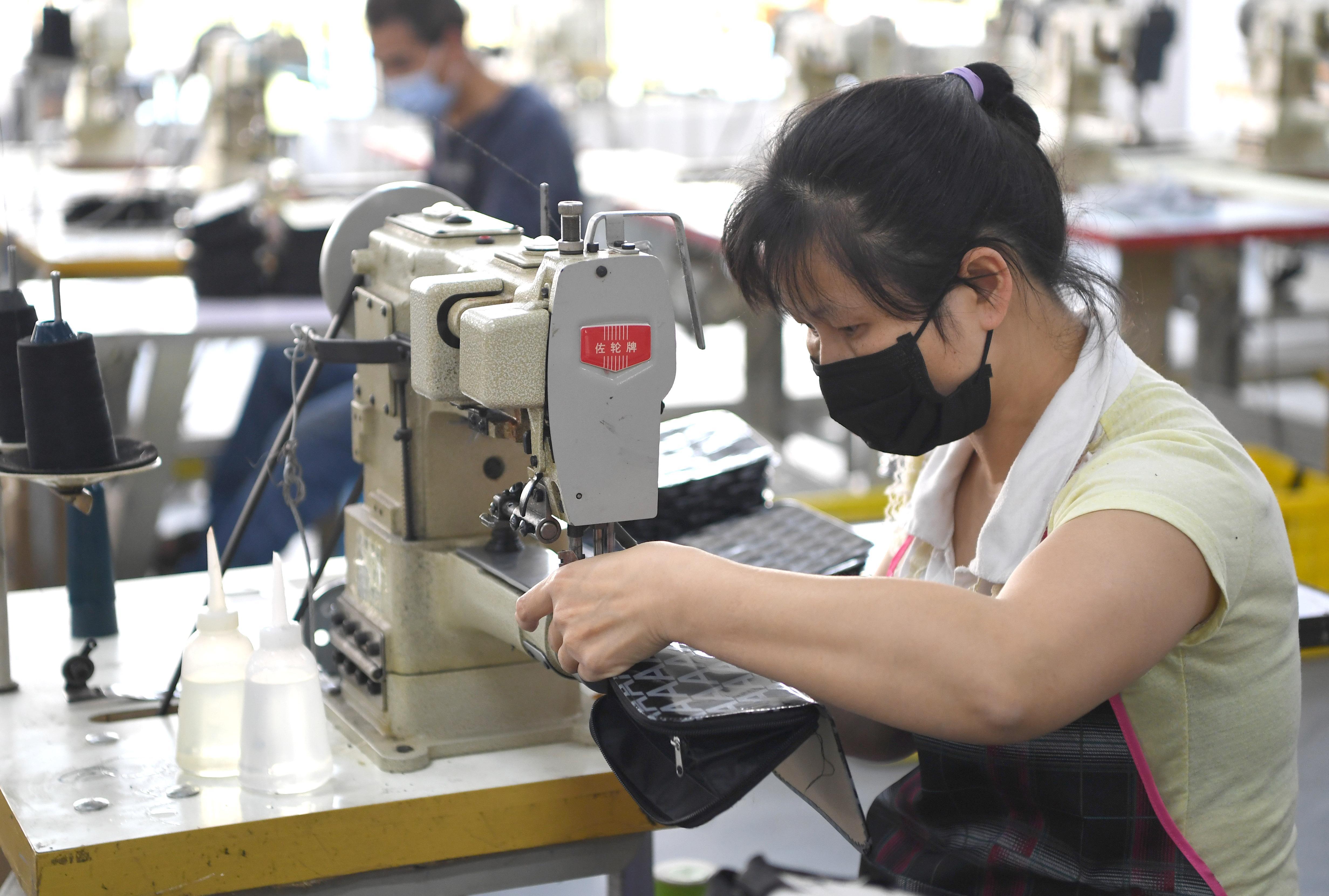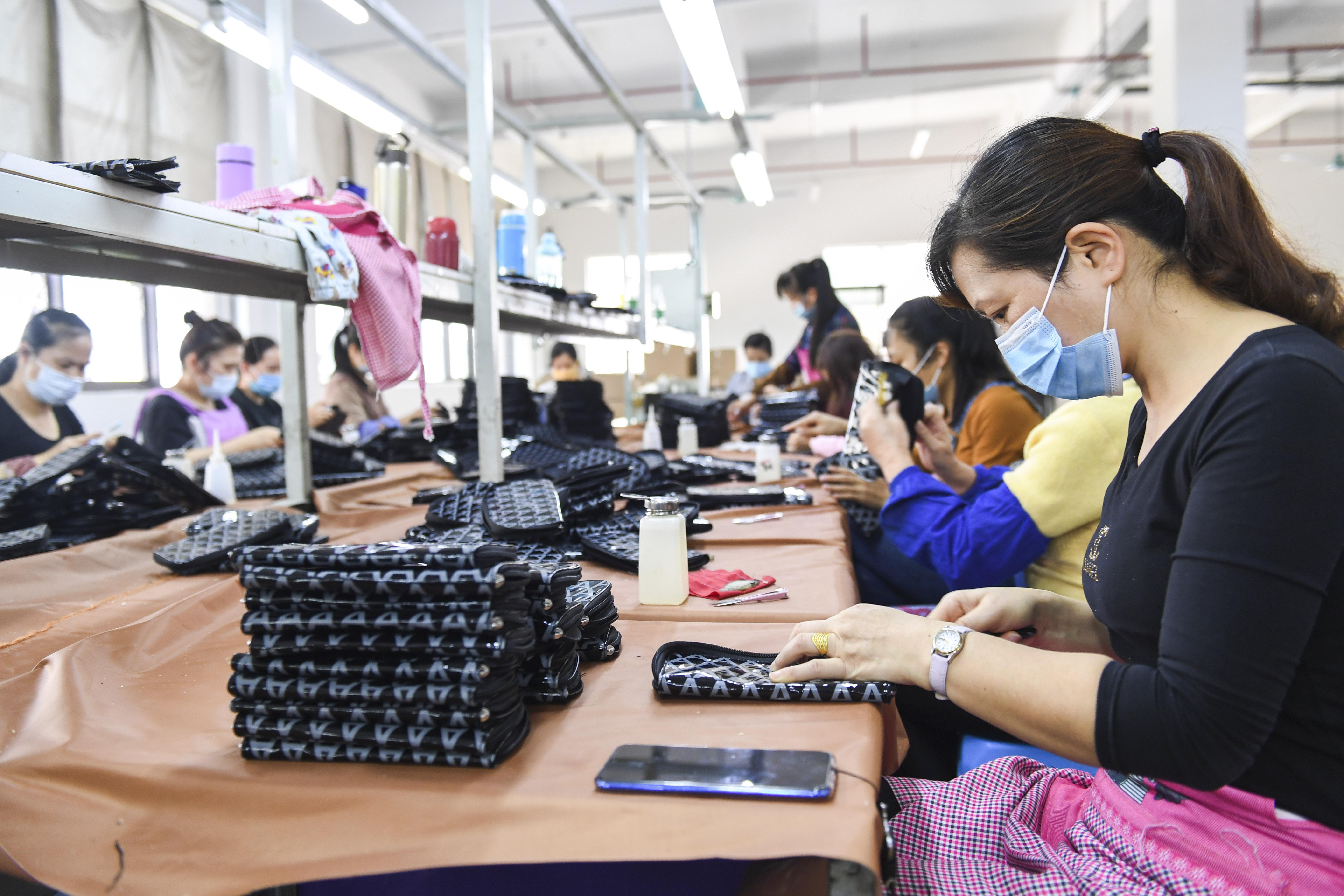 4月15日,搬迁群众在广西百色市田阳区易地扶贫搬迁安置点小区“老乡家园”内的扶贫车间工作。